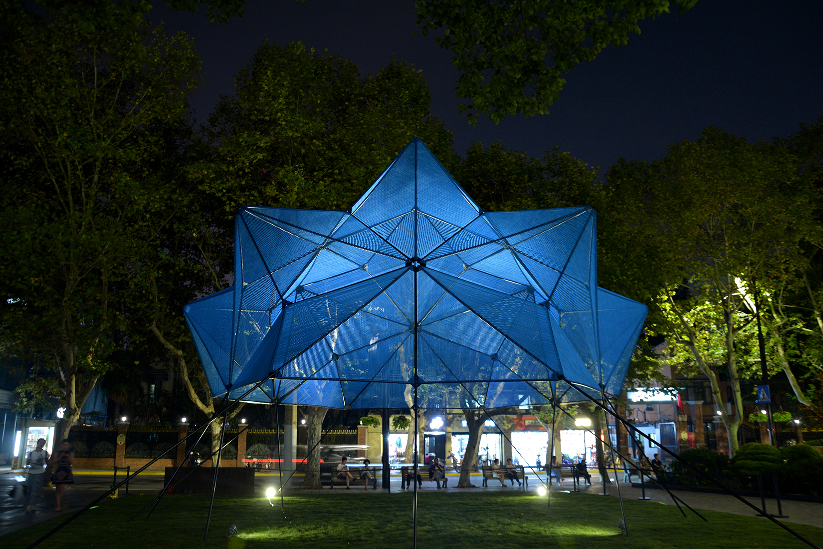 El escenario está destinado a albergar eventos, como reuniones, conferencias y otras invitaciones abiertas al público, que pueden llevarse a cabo bajo el "Muffin" de cobalto durante los diez meses de la exposición. Actúa como una presencia geométrica que flota en el suelo y su aparente complejidad en realidad está compuesta por 60 triángulos idénticos cubiertos por un cordón elástico semitransparente