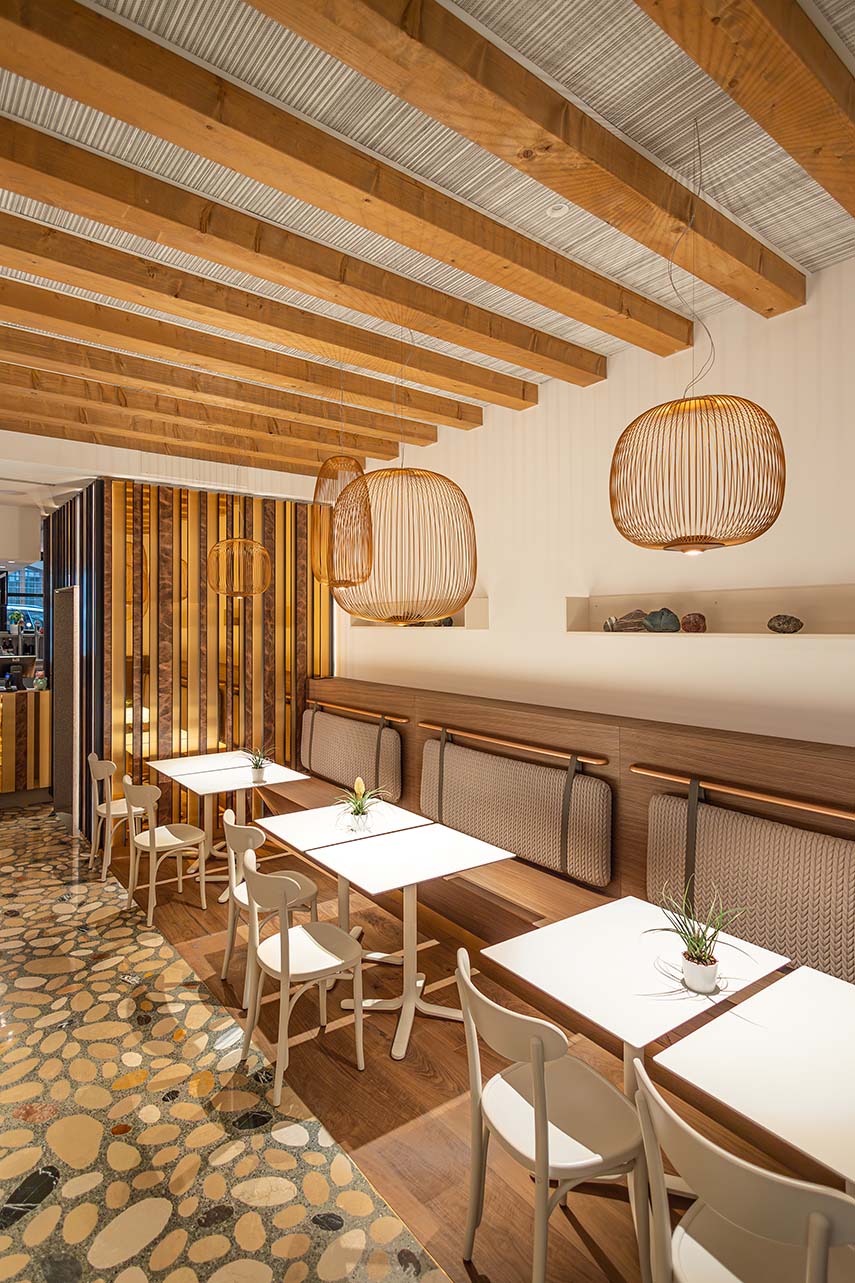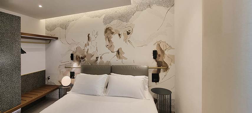 El proyecto ha dedicado gran atención a la calidad acústica de los ambientes, integrando paneles acústicos tridimensionales que, además de mejorar la estética, optimizan el bienestar sonoro de los espacios. Estos paneles difunden el sonido de manera armónica, creando un ambiente acústicamente equilibrado. La solución ha sido particularmente efectiva en las áreas comunes, como el vestíbulo y el salón, donde la gestión del sonido es fundamental para garantizar el máximo confort a los huéspedes.