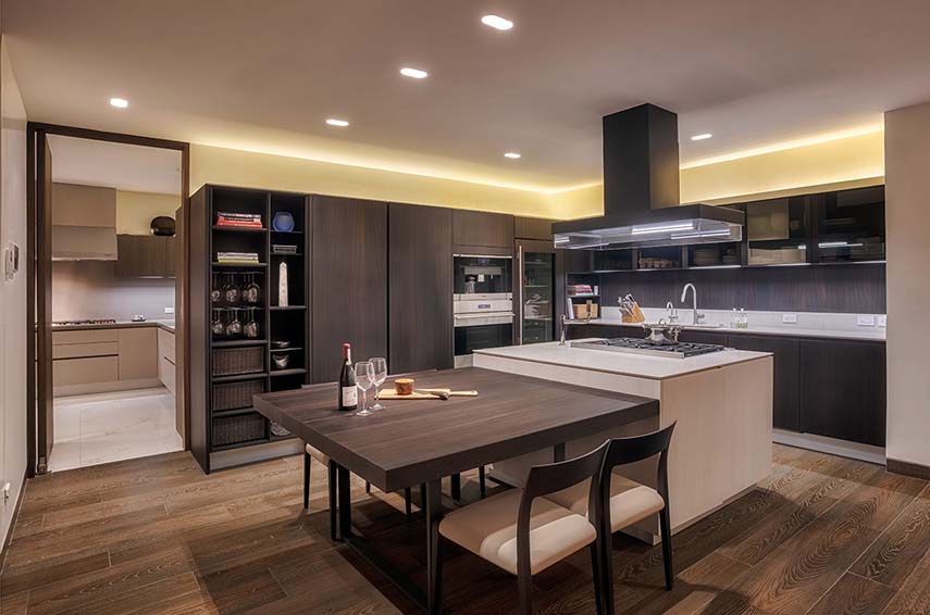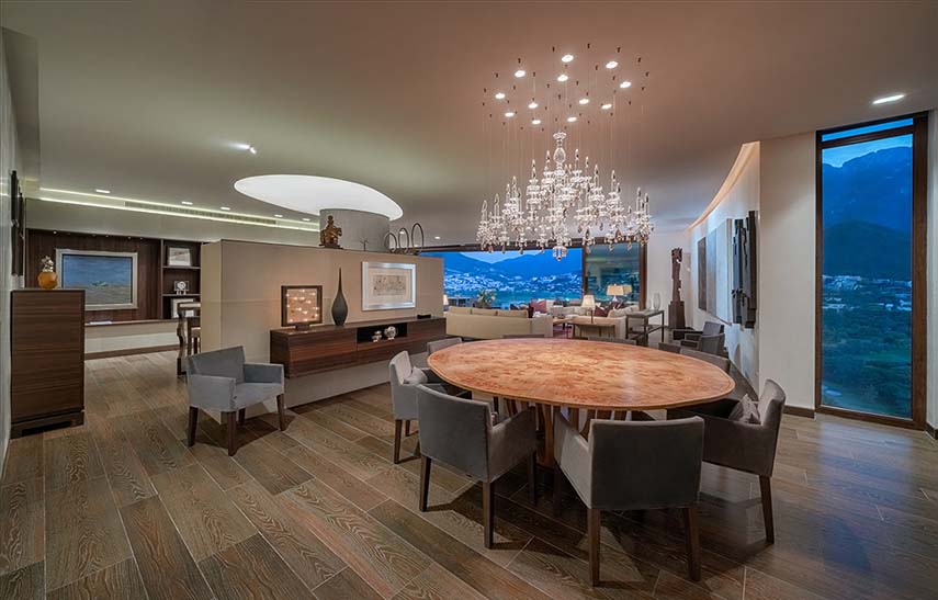 El estudio mexicano López Duplan Arquitectos, especializado en proyectos de diseño de interiores para residencias de lujo, completó en 2024 el Departamento R&J. Un apartamento único en su clase: planta circular, amplia superficie y vistas impresionantes. El diseño se centra en el núcleo de distribución vertical que ocupa el centro del espacio. El bloque de ascensores está revestido en madera en dos paredes, donde se ocultan las puertas que conducen a las diferentes áreas de la residencia, y una en granito gris a juego con el suelo