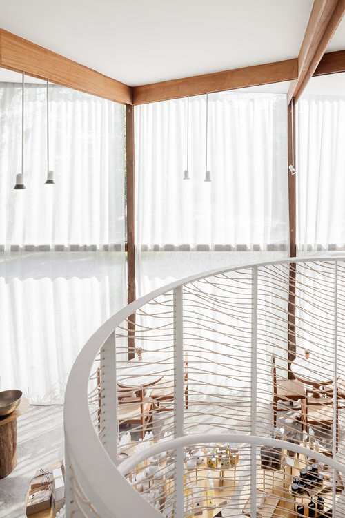 El diseño del techo y la composición de los postes de madera del interior hacen referencia a la vista panorámica de los cocoteros y palmeras de la granja ecológica de Patom, la empresa que produce los productos de cuidado corporal que se venden en la tienda