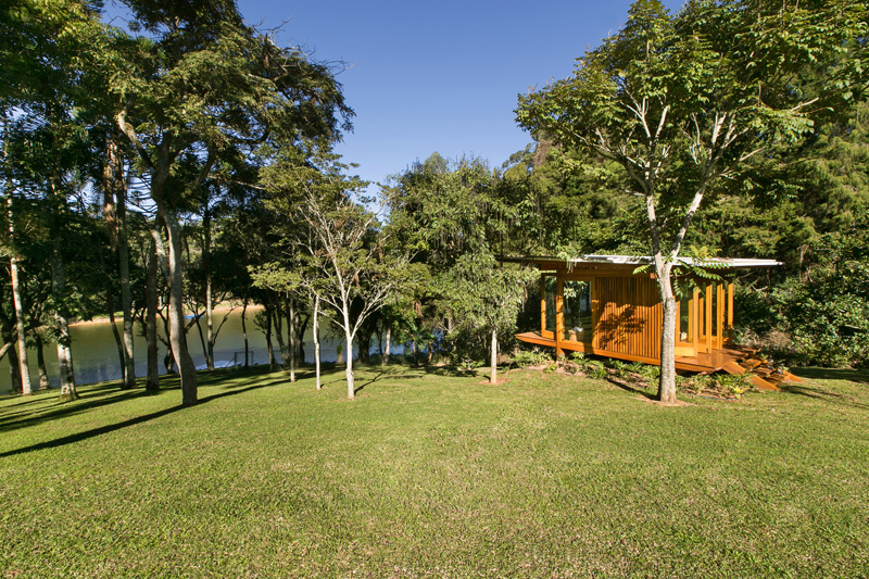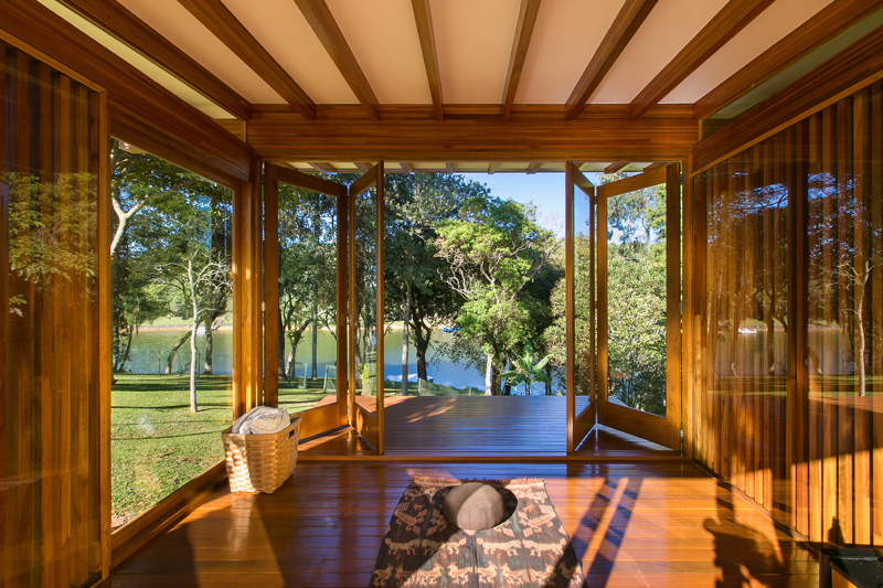 El pabellón de madera, diseñado por el estudio brasileño DT estudio en São Paulo, responde a las necesidades de sus clientes, que querían un pabellón como un bloque aislado, donde pudieran mediar y estar en contacto con la naturaleza