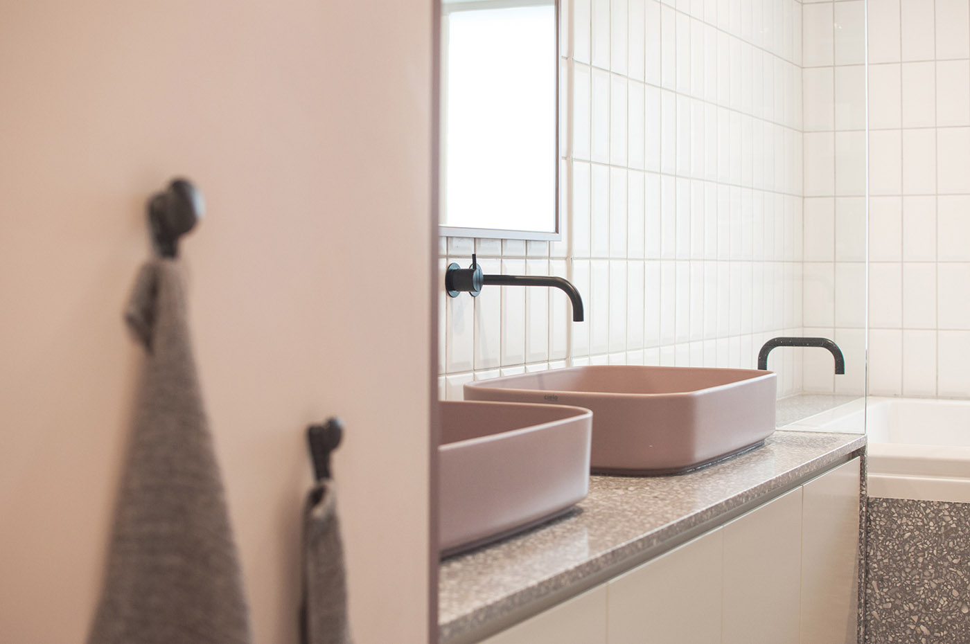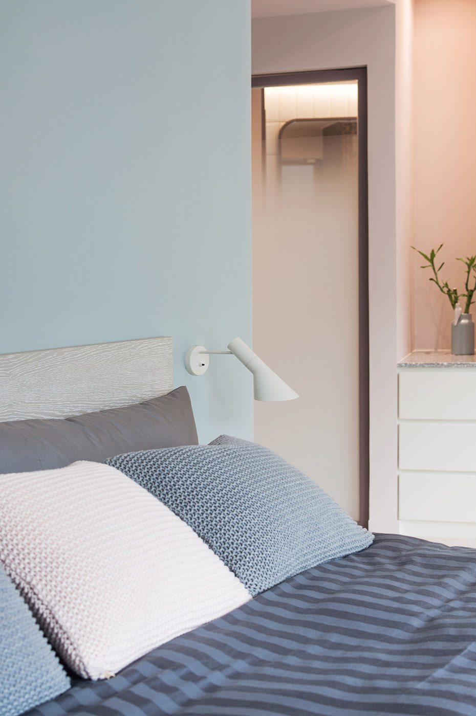 Colores y materiales son utilizados para definir las diferentes áreas del apartamento: tonos de gris y azul para los dormitorios, la cocina y el comedor, el rosa para los baños. La madera en el piso es utilizada para las zonas de día y noche para generar relax