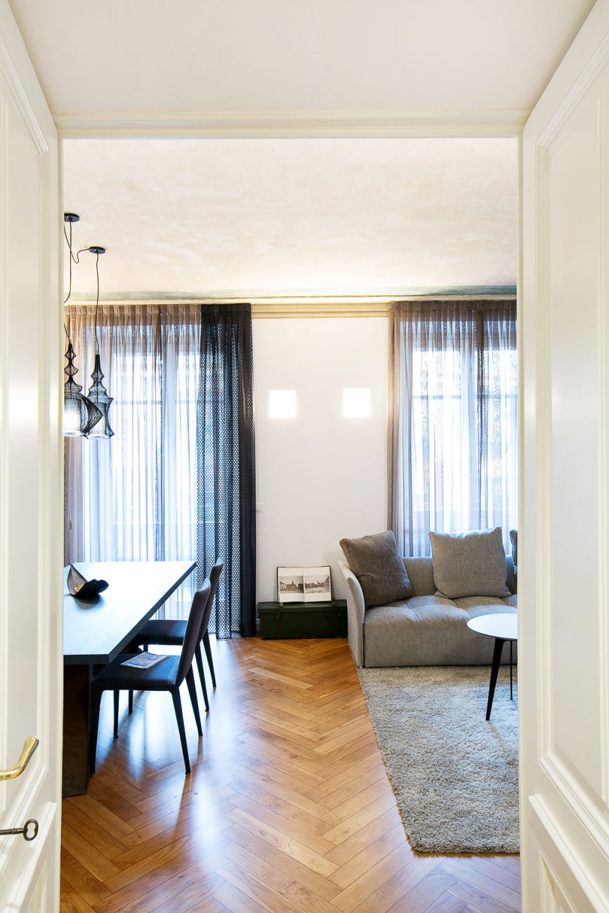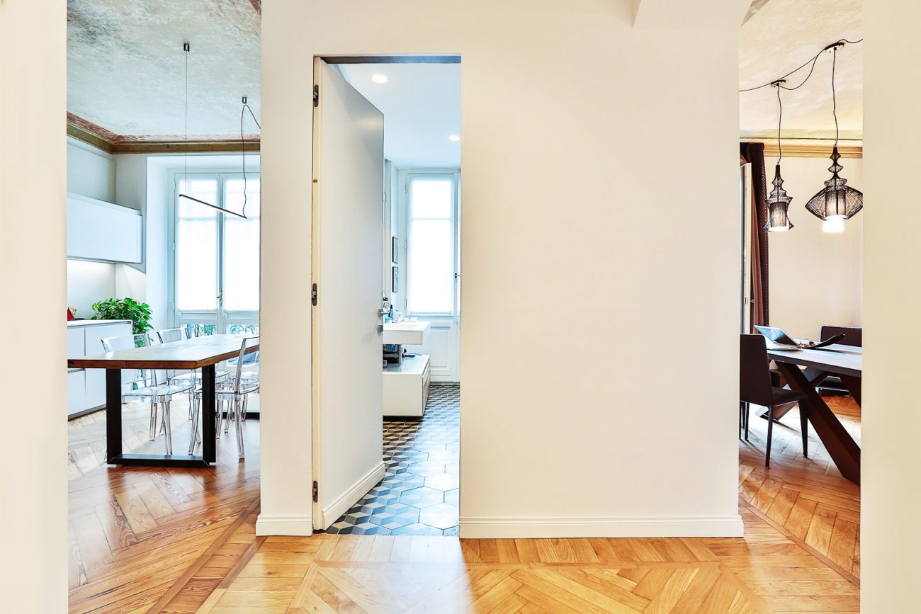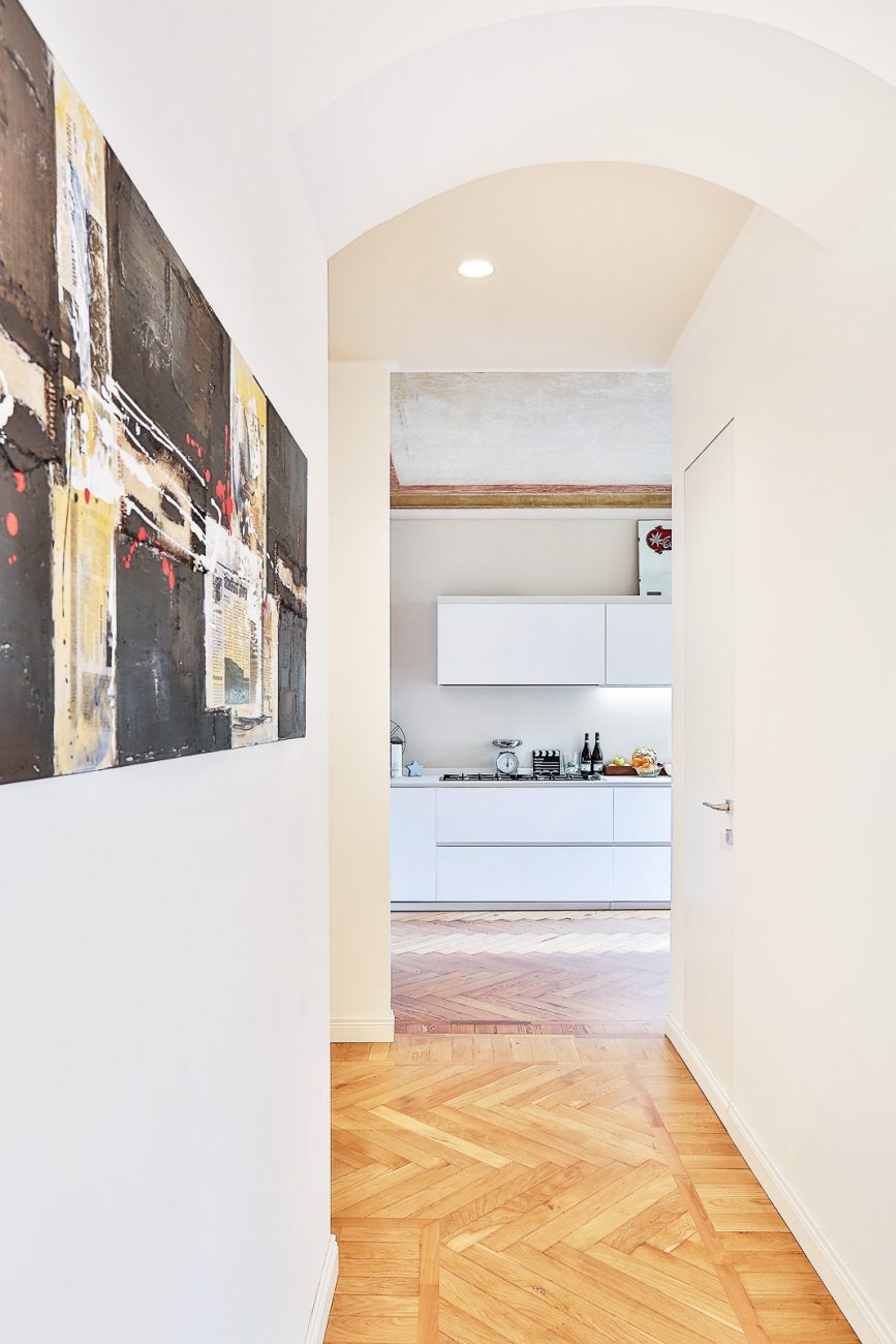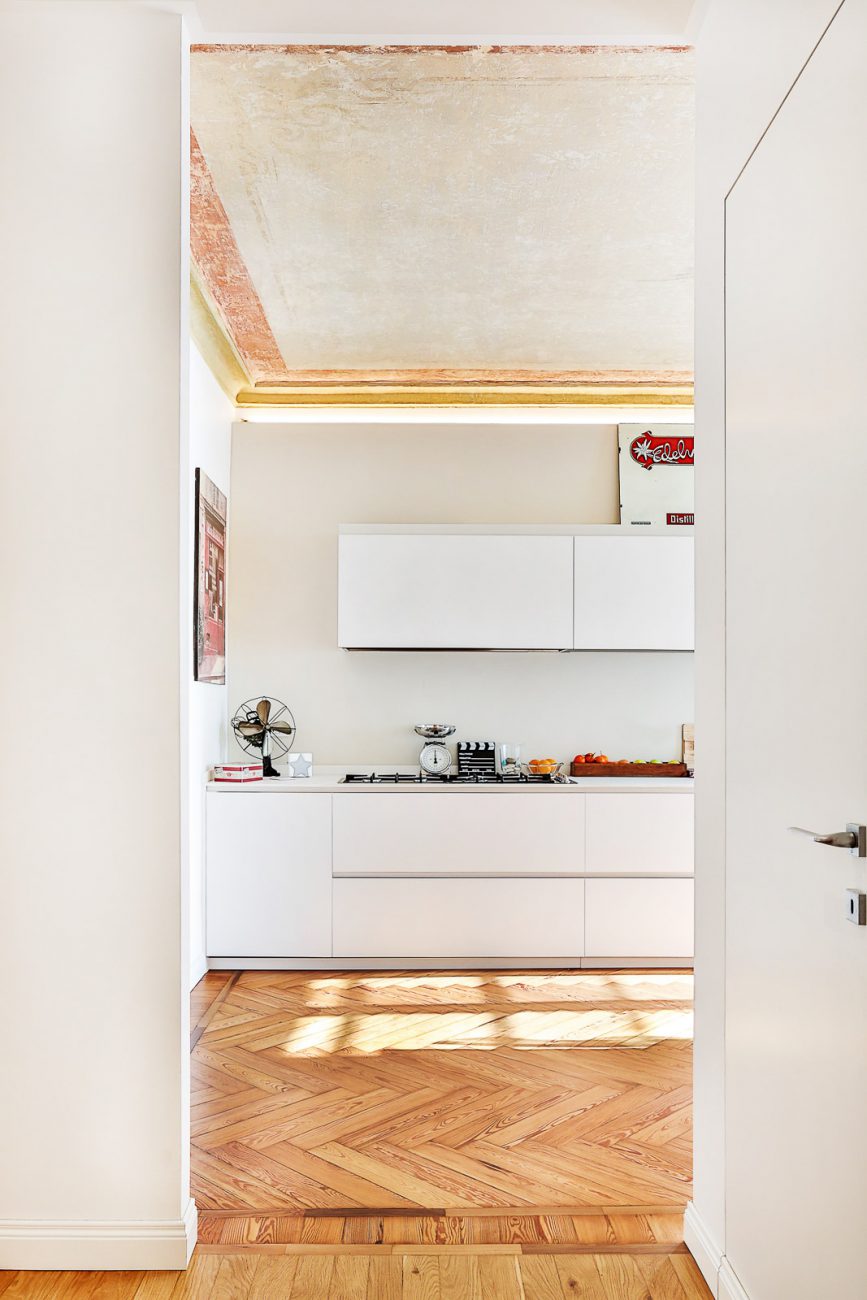 Los arquitectos del estudio de arquitectura turinés Officina 8A reestructuran un apartamento ofreciendo al cliente una decoración contemporánea de frescos y estucos restaurados y restaurados