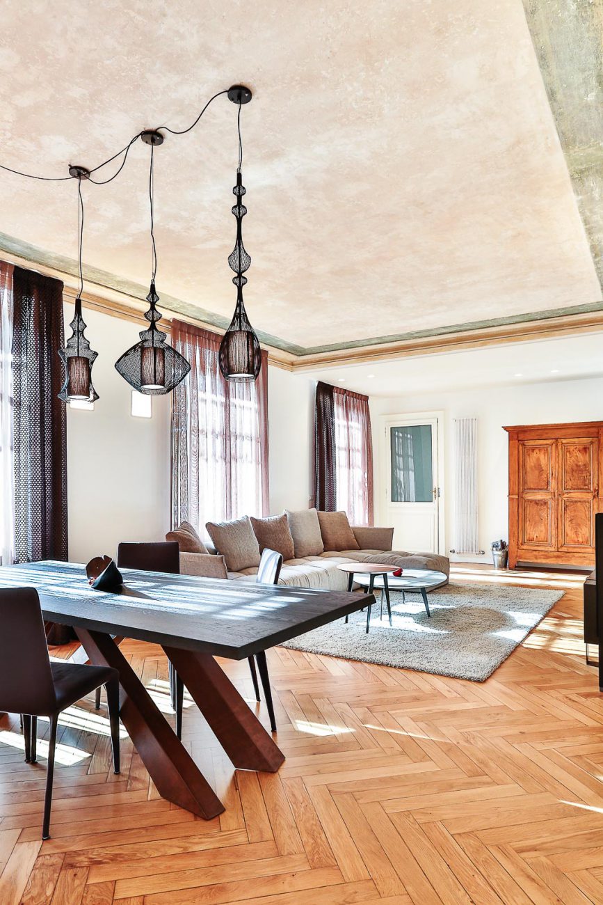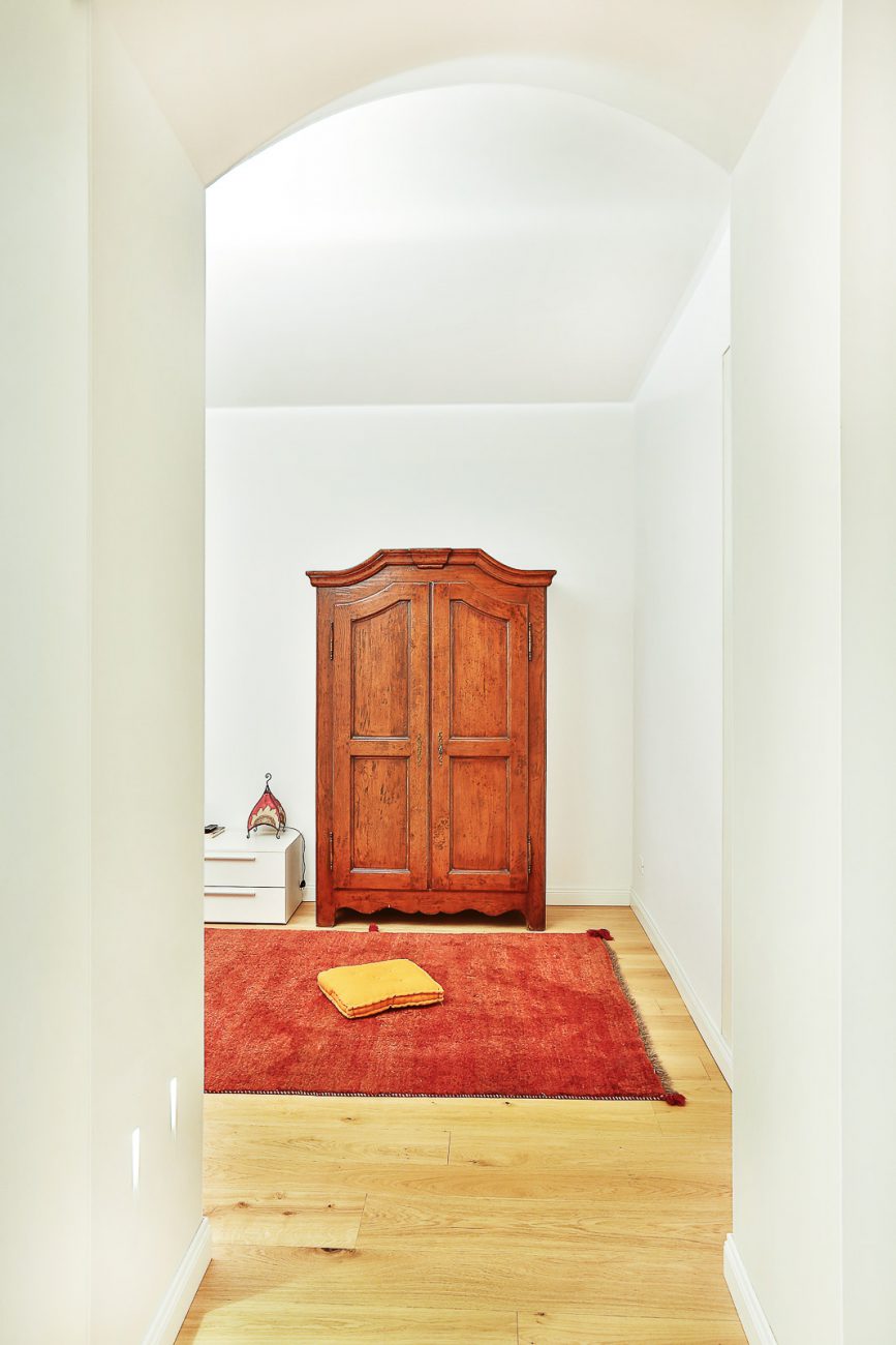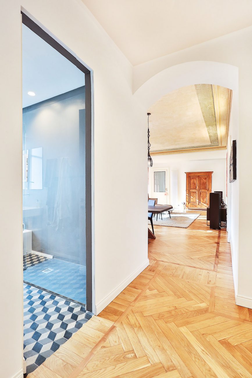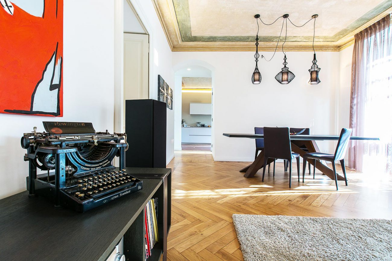 Los arquitectos del estudio de arquitectura turinés Officina 8A reestructuran un apartamento ofreciendo al cliente una decoración contemporánea de frescos y estucos restaurados y restaurados
