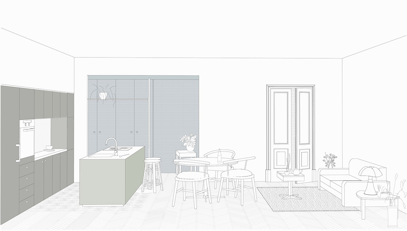 La entrada, de color azul, da la bienvenida al visitante y conduce directamente al espacio principal del piso: uno se encuentra inmediatamente con la cocina, con su gran isla central con puertas moldeadas de color verde salvia y encimera de mármol, complementada por la pared de muebles altos y la encimera en un tono más oscuro que contrasta con la parte trasera de espejo. La isla se eleva sobre una alfombra de azulejos tradicionales italianos, rescatada del dormitorio, y el zócalo de espejos la reverbera, reduciendo el impacto del volumen, que parece levitar