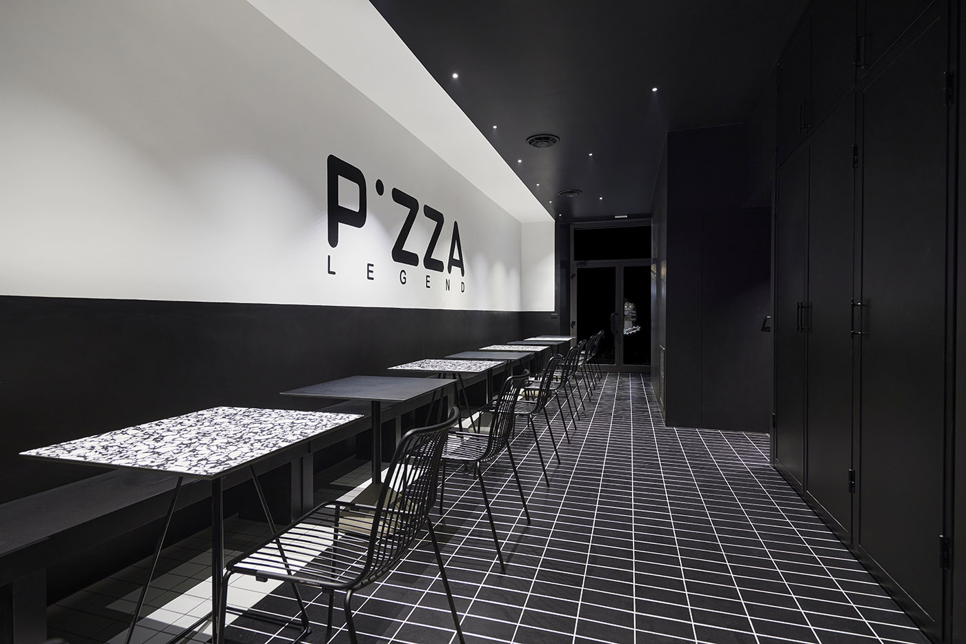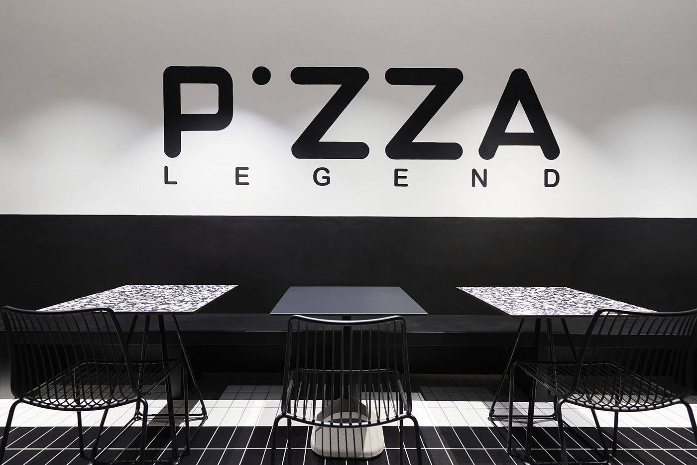 "Cuando la luna te abre los ojos como una gran pizza... eso es amor", así cantaba Dean Martin, y desde aquí comenzó la búsqueda estética y funcional del arquitecto Emanuele Svetti para crear Pizza Legend. Un entorno nuevo, no convencional, donde la presencia de elementos surrealistas, que evocan dimensiones oníricas, pudieran unirse a un juego de geometrías bidimensionales: el blanco y negro de las superficies literalmente "desgarrado" por la inesperada llegada de un Gigante de hierro que se asoma desde el techo en una perspectiva inédita