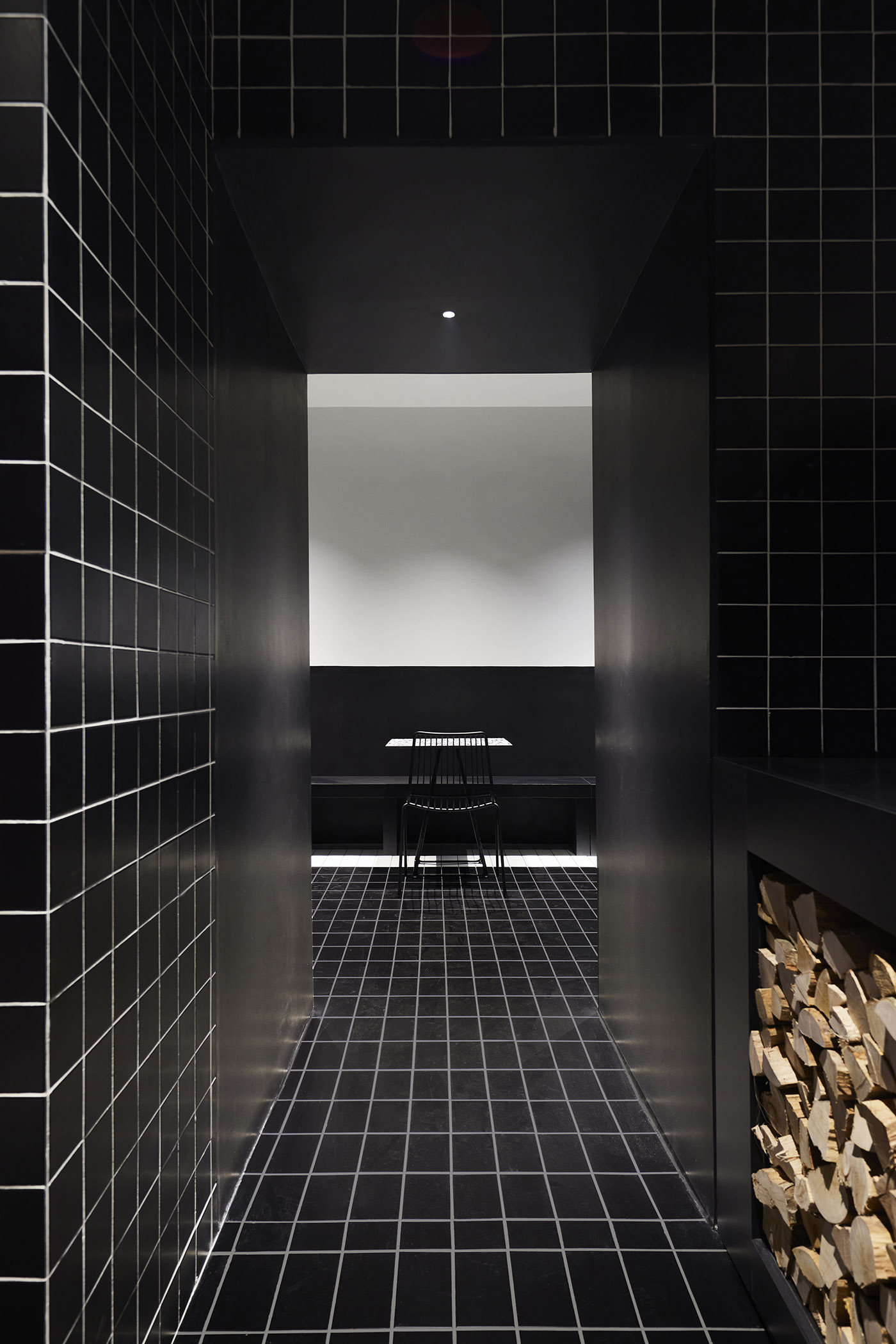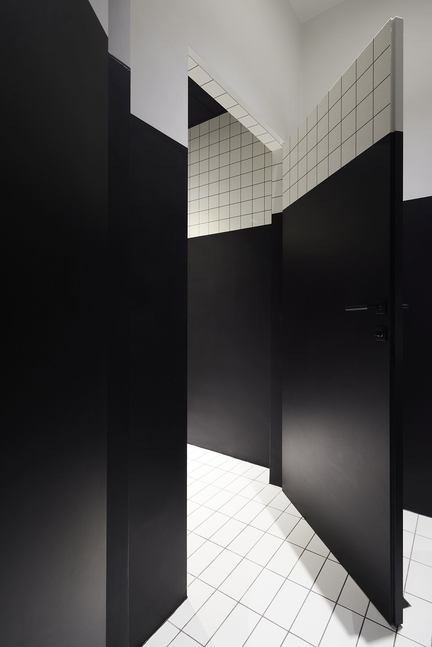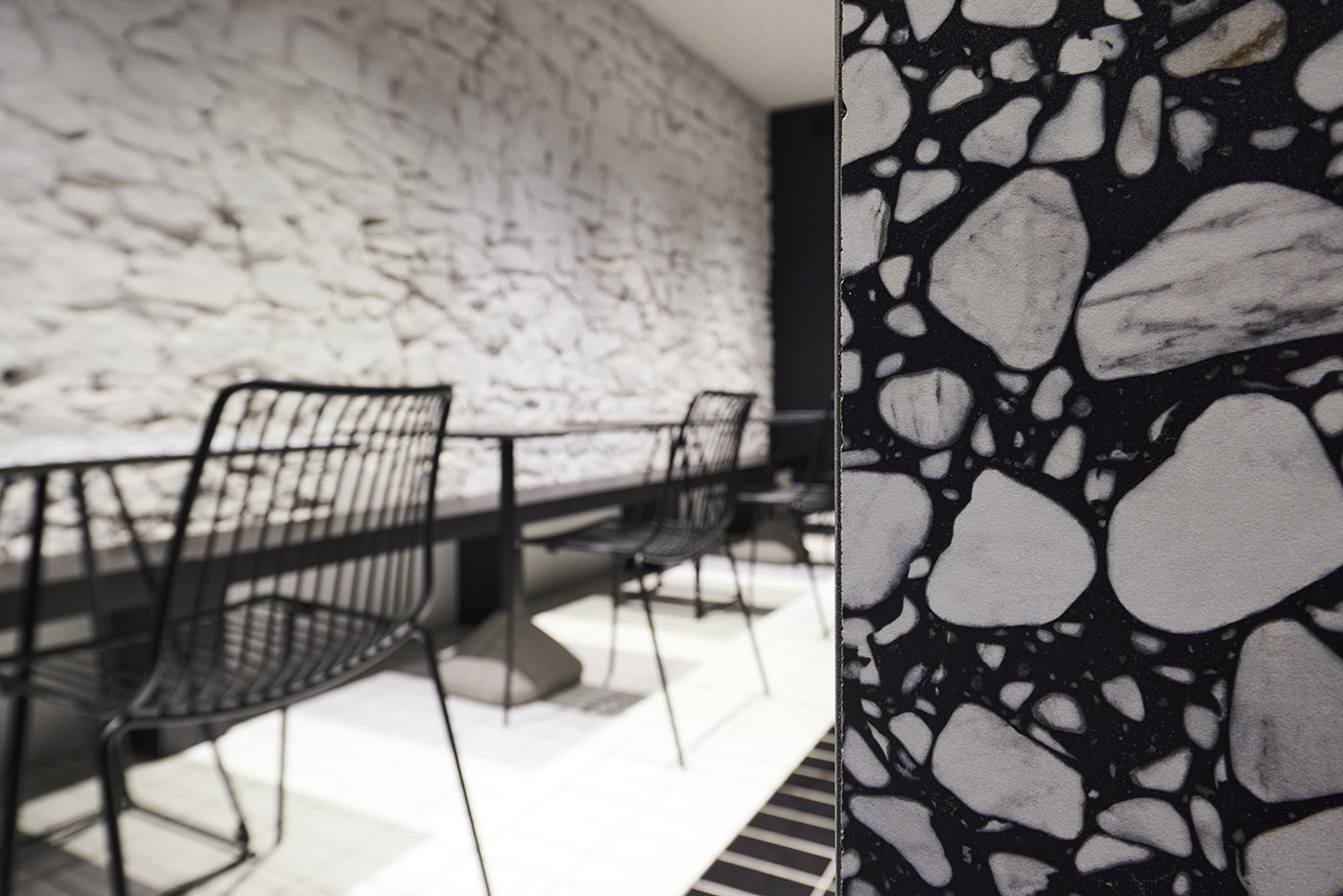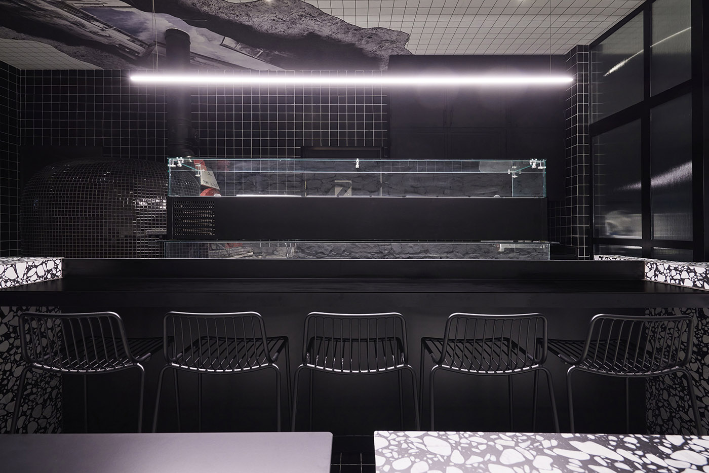 Un trabajo de "alta costura espacial" realizado codo a codo con los pizzaiolos, buscando la mejor optimización espacial posible y creando así un armonioso compromiso entre estilo y funcionalidad. Un revestimiento de gres que crea motivos geométricos, alternado con esmalte mural blanco y negro, junto con papel tapiz aplicado de manera no convencional en el techo, son los elementos decorativos de esta intervención única. Al entrar al local, el cliente es recibido por un robot que sale curioso para saludar a través de una abertura en el techo desde donde se vislumbra parte del horizonte de Cortona