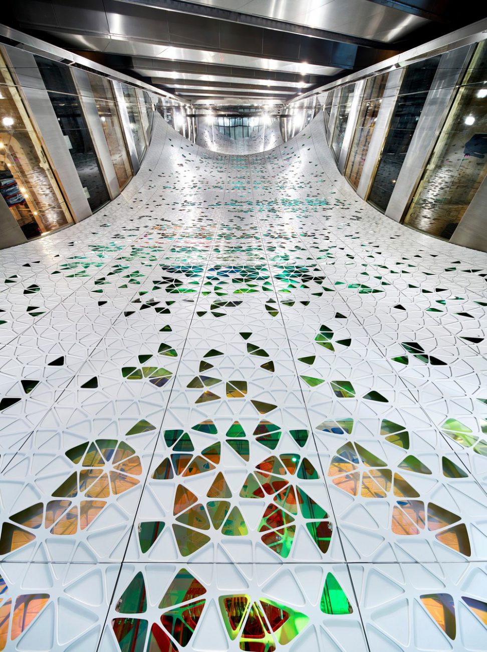 I visitatori si avvicinano allo spazio attraverso un vestibolo scuro che porta alle scale mobili dietro lo specchio a senso unico. Tra il 4 ° e il 8 ° piano, un'apertura nella parete a specchio a senso unico dà una vista libera del velo. La progressione attraverso gli spazi offre prospettive e momenti diversi per sperimentare il gioco in continuo mutamento della luce e del colore nel vuoto. Agendo come la spina dorsale dell'edificio principale, trasmette l'energia ai differenti concetti di vendita al dettaglio su ogni piano e fa parte della storia dell'edificio al presente