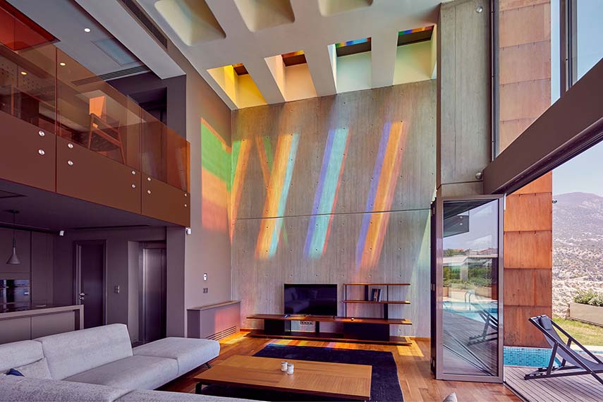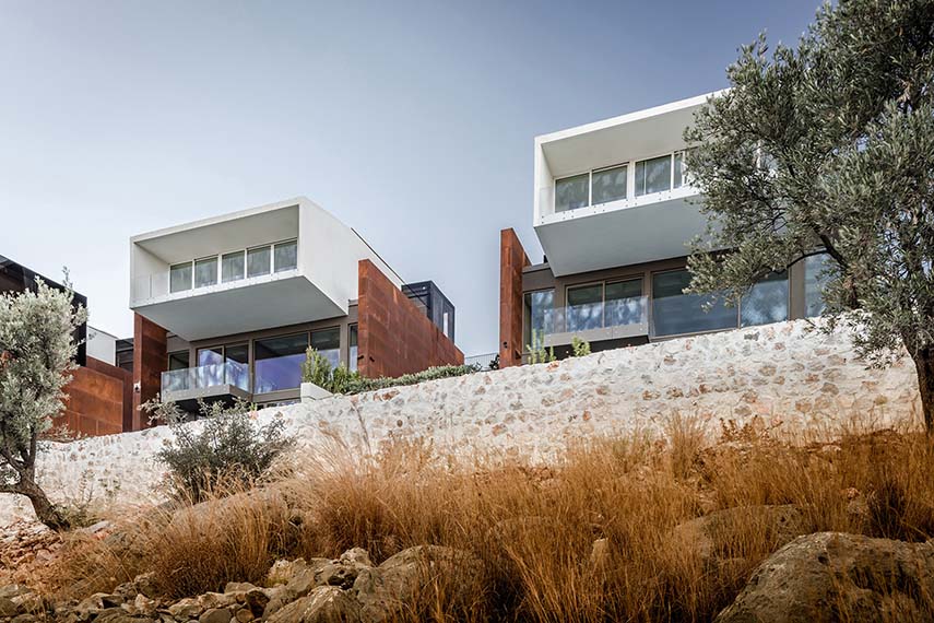 Los suelos de madera laminada, los muebles, los elementos de iluminación y los accesorios están en armonía cromática con la fachada de corten. También, la inclusión de elementos paisajísticos en el proyecto arquitectónico, como plantas y elementos autóctonos, tiene como objetivo enraizar cada villa en su entorno.