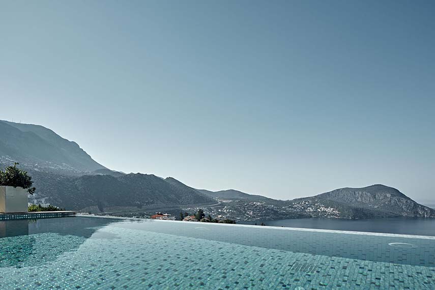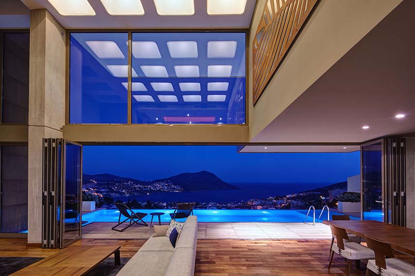 En contraste con la textura cálida y rugosa de la parte inferior, la parte superior mantiene un sentido de pureza y ligereza con el uso de texturas lisas y tonos blancos. El lujoso mármol para suelos y revestimientos murales, la pintura, los muebles, los servicios sanitarios y los elementos de iluminación fueron todos elegidos para reflejar esta visión. La película de color naranja que se ha colocado en los barandales transparentes de las galerías atrae la mirada hacia arriba, enfatizando la profundidad y la relación visual vertical entre los pisos y las dos partes que componen cada villa.