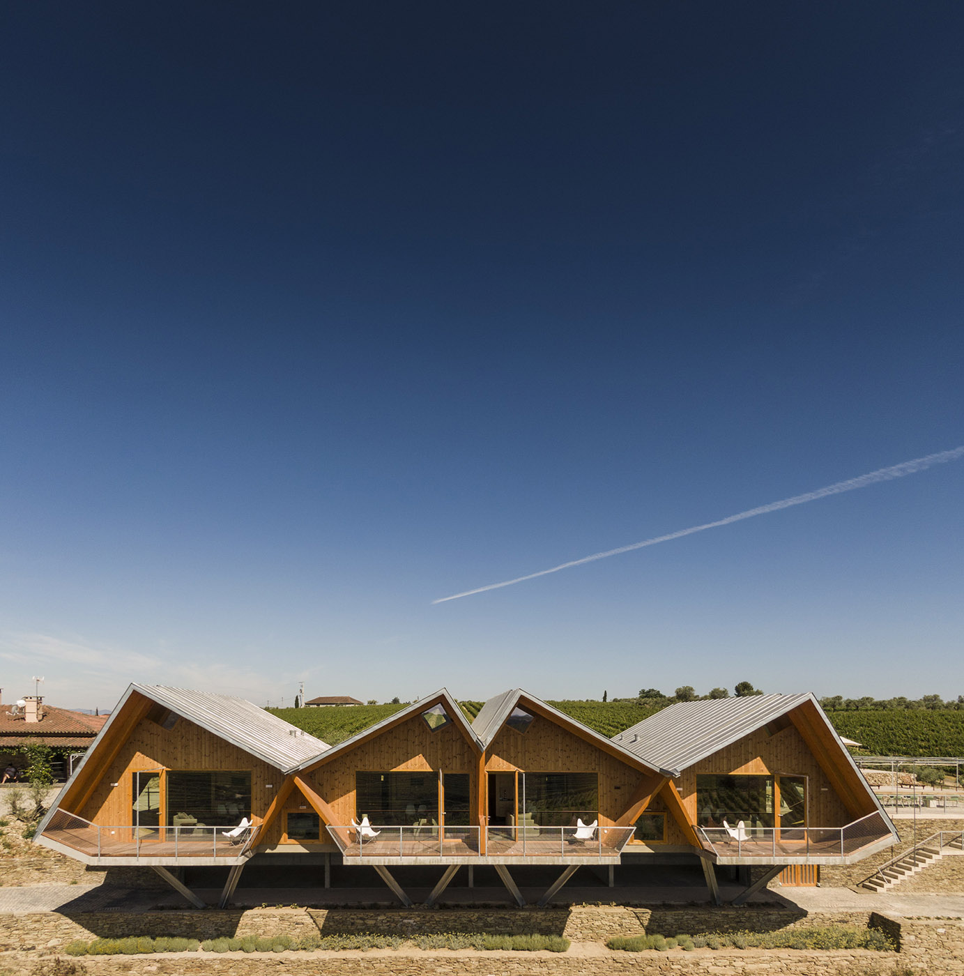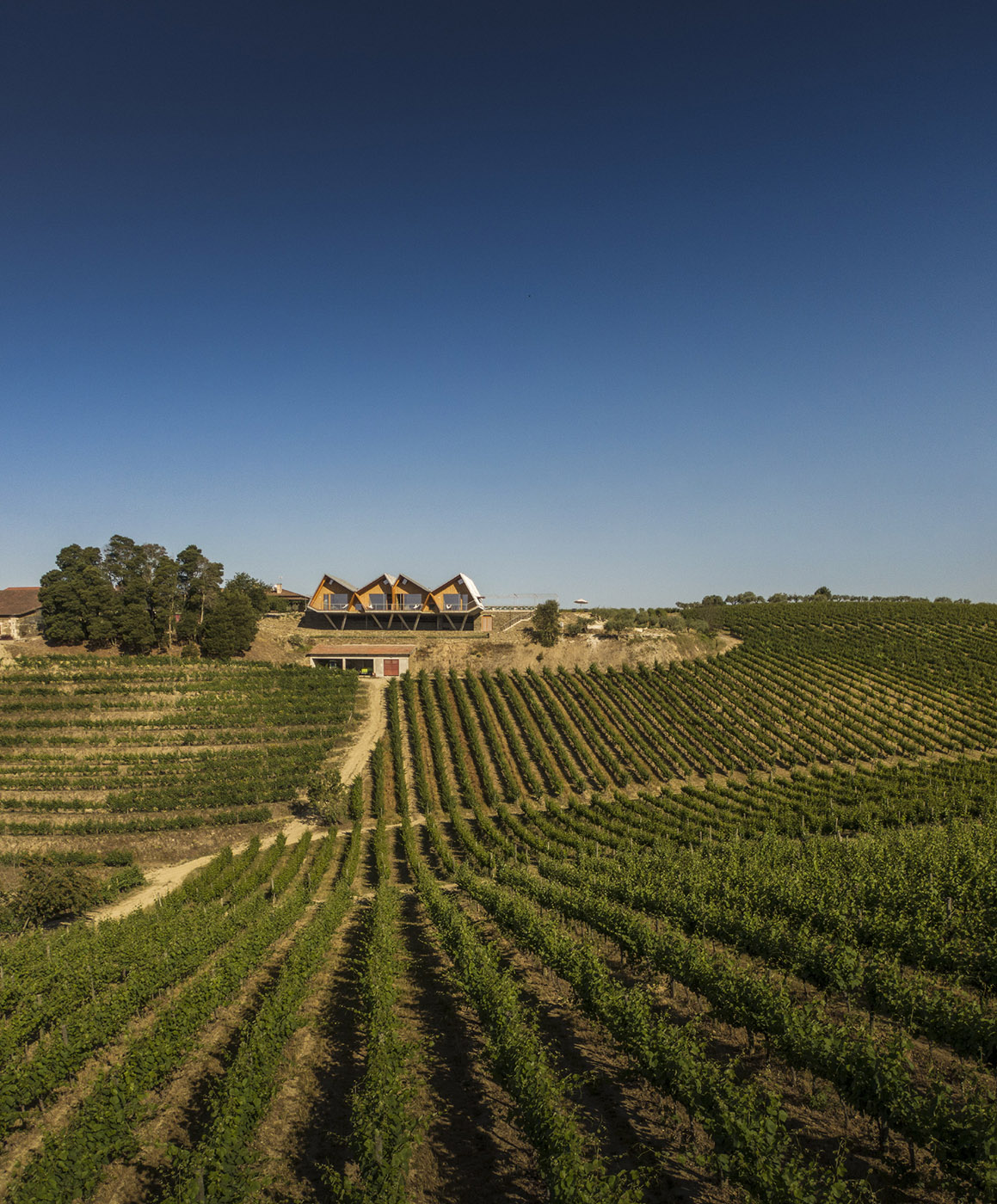 Nos encontramos suspendidos sobre el paisaje: una vez finalizada la remodelación de la Adega da Quinta da Faisca, la necesidad de ofrecer un alojamiento para los visitantes se eleva por encima de los viñedos, las casas existentes y la propia bodega