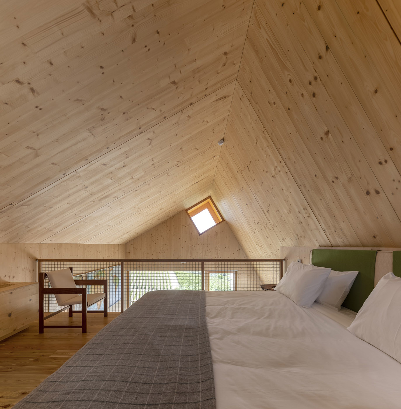 Nos encontramos suspendidos sobre el paisaje. Todo es de madera: las estructuras de las paredes se funden con los techos, los marcos de las puertas y las ventanas, el revestimiento exterior. El tejado y los tapajuntas son de zinc y todo está hecho con esmero y gran profesionalidad. Rigurosidad exigida y comprendida