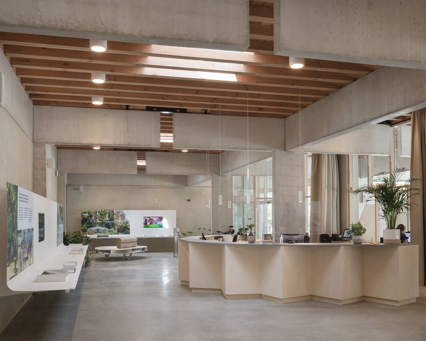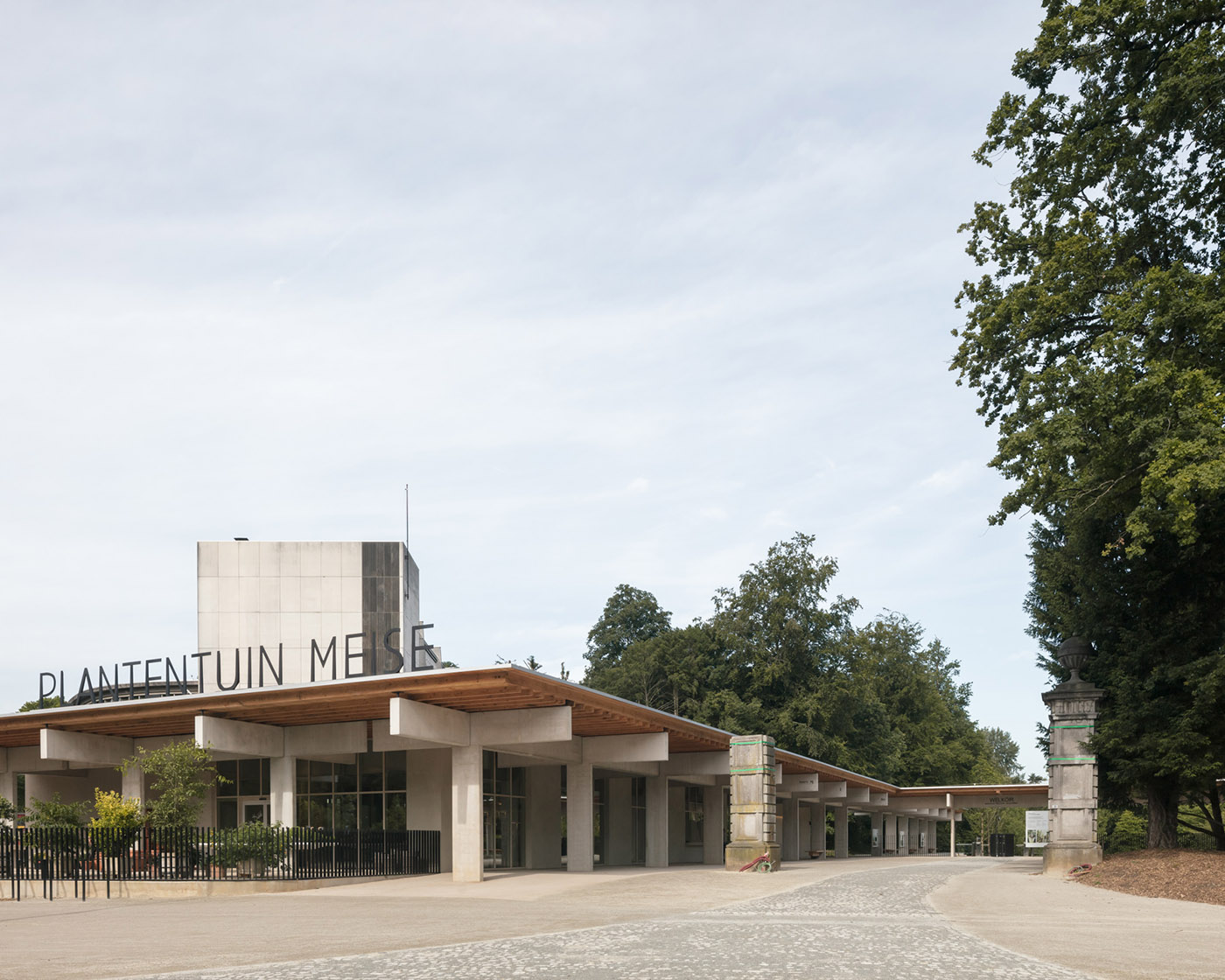 La fuerza del nuevo edificio de recepción reside en el contraste entre la arquitectura horizontal y la verticalidad de los árboles circundantes, así como del imponente edificio del Herbario. Los arquitectos de NU architectuuratelier diseñan el nuevo edificio con una estructura de marquesina, de modo que el interior y el exterior fluyen sin solución de continuidad. El edificio para las nuevas zonas de recepción está presente, pero subordinado al paisaje