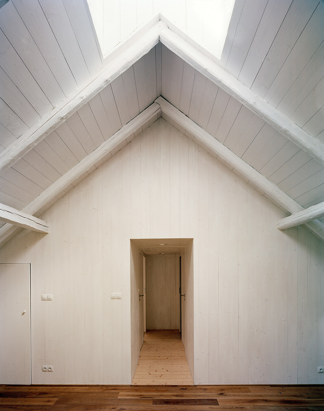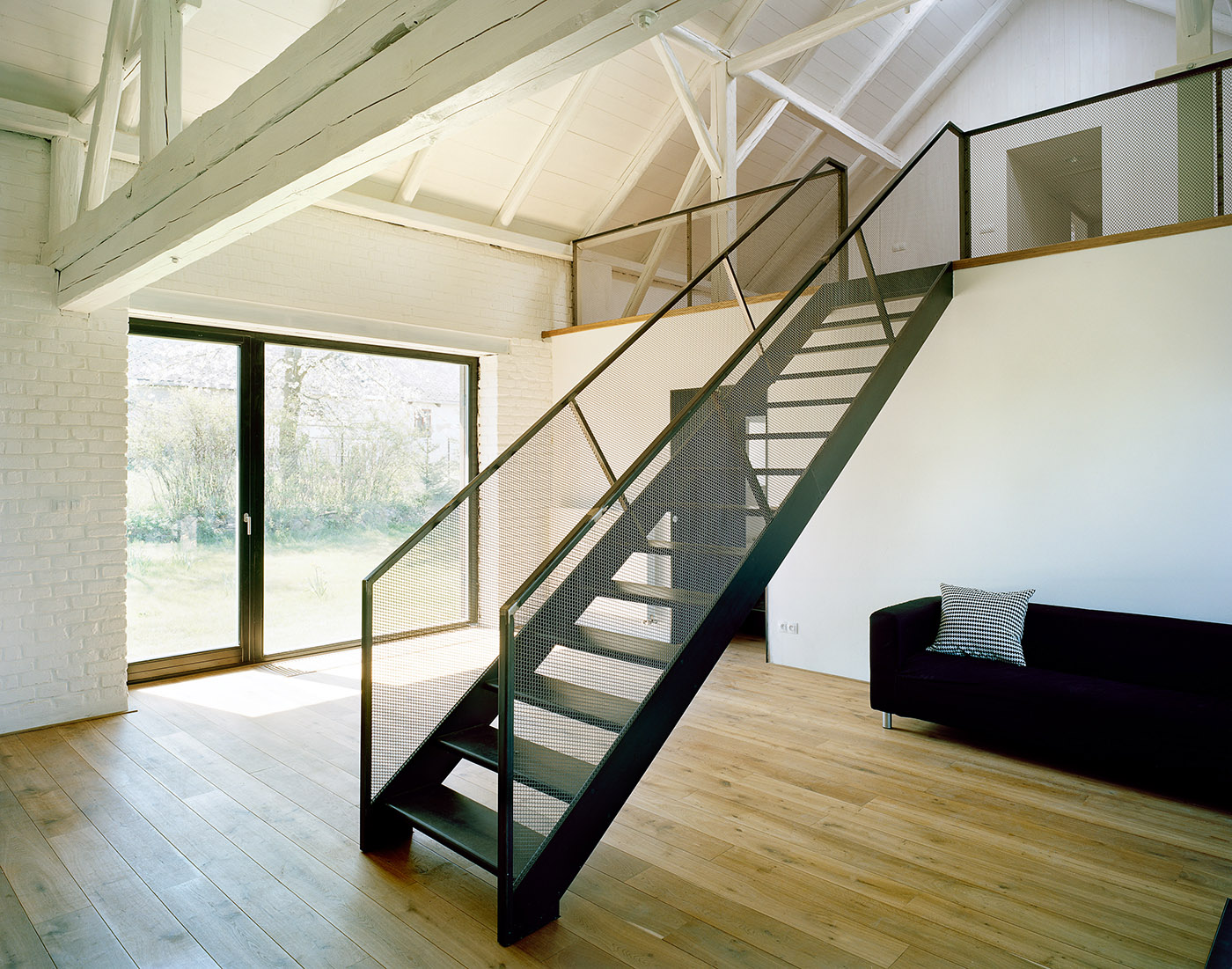 Se ha conservado el armazón original del tejado junto con las paredes, y se han unificado con pintura blanca. Una nueva puerta da acceso al granero, creando un nuevo pasillo. Las nuevas zonas habitables están aisladas del exterior por un revestimiento de lana mineral y el yeso de cal de la parte delantera ha sido reestructurado