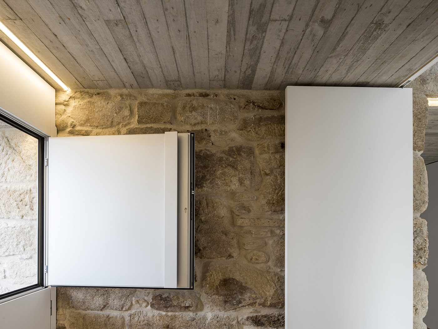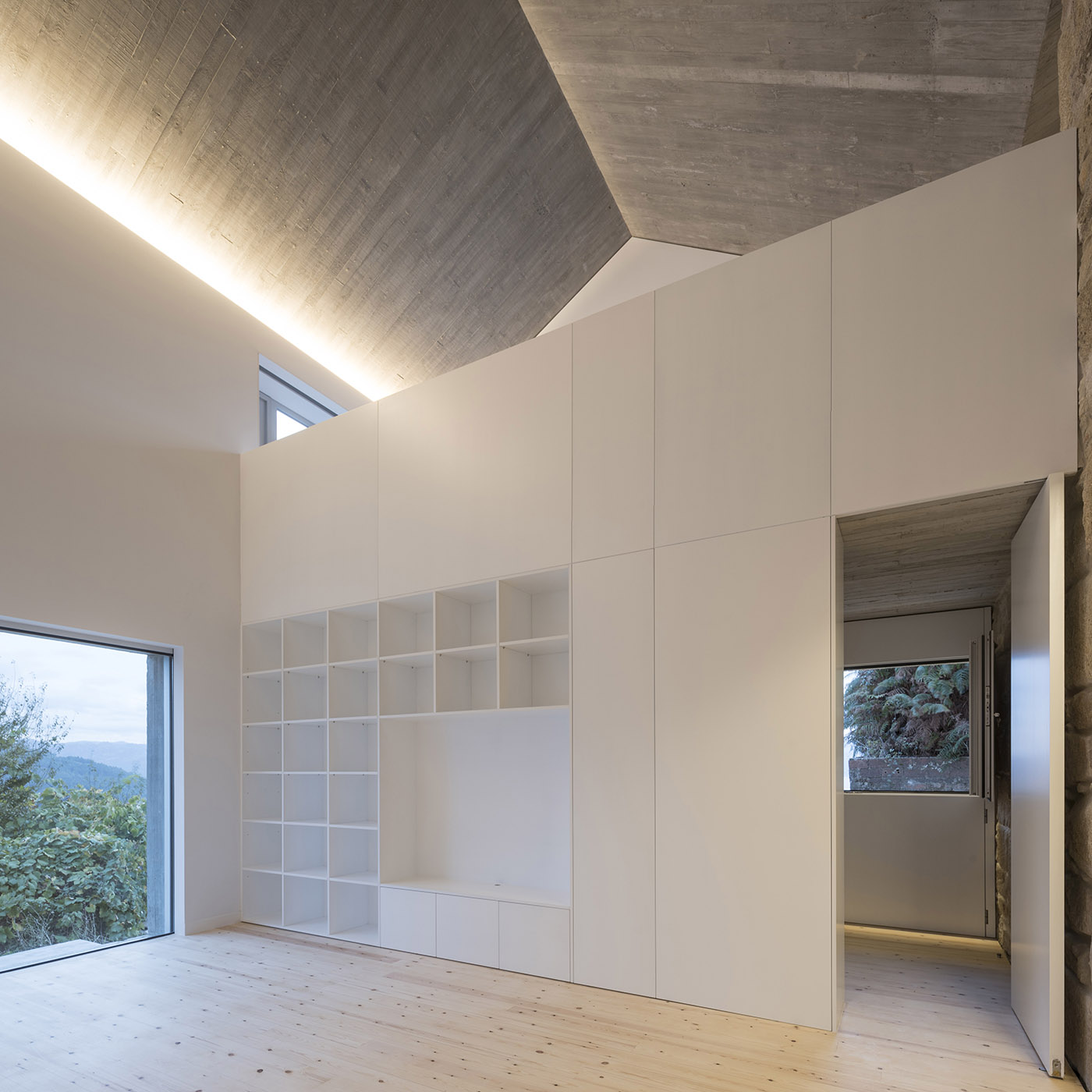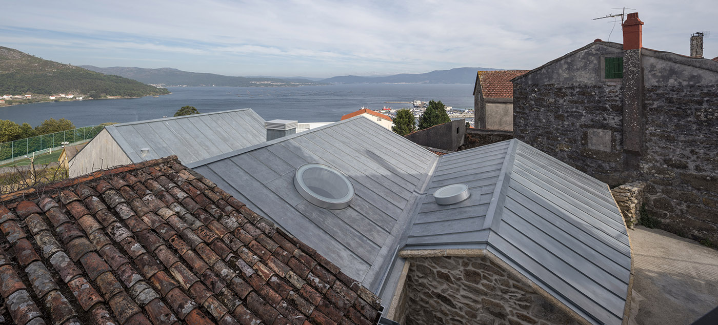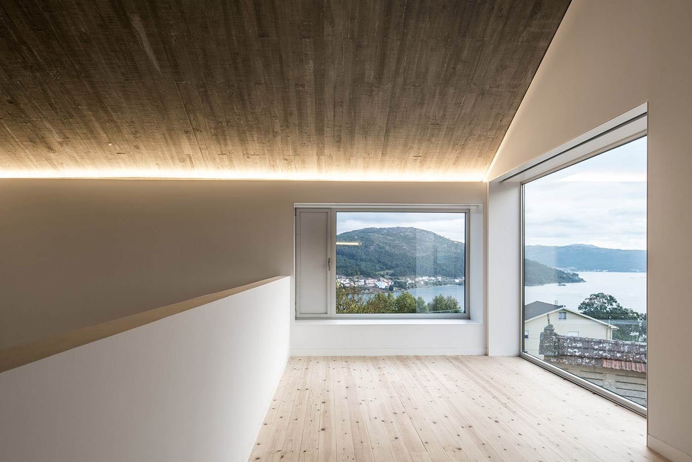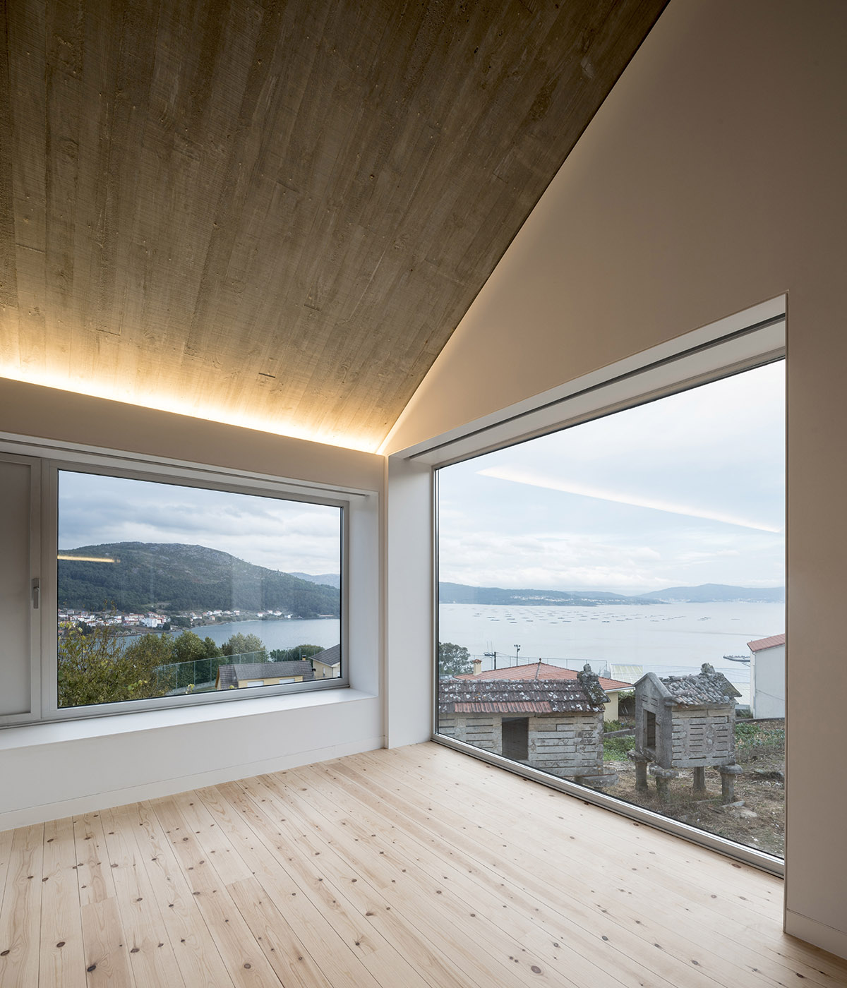 Se introducen tres tragaluces, en el comedor, en la ducha y en el antiguo bloque, de modo talque se favorezca la iluminación de los espacios internos. El interior tiene espacios fluidos, las habitaciones de la casa tienen diferentes alturas y cada una tiene un carácter único. El interior se unifica mediante el uso de un solo material, el pino gallego, que da calidez al interior de la casa