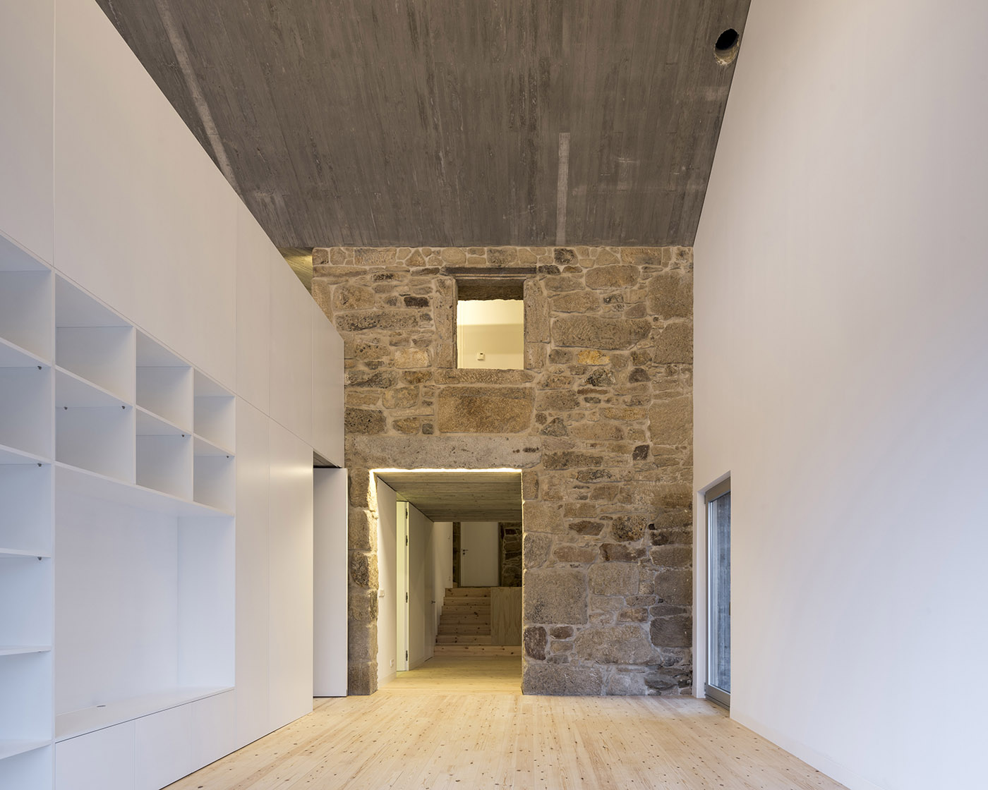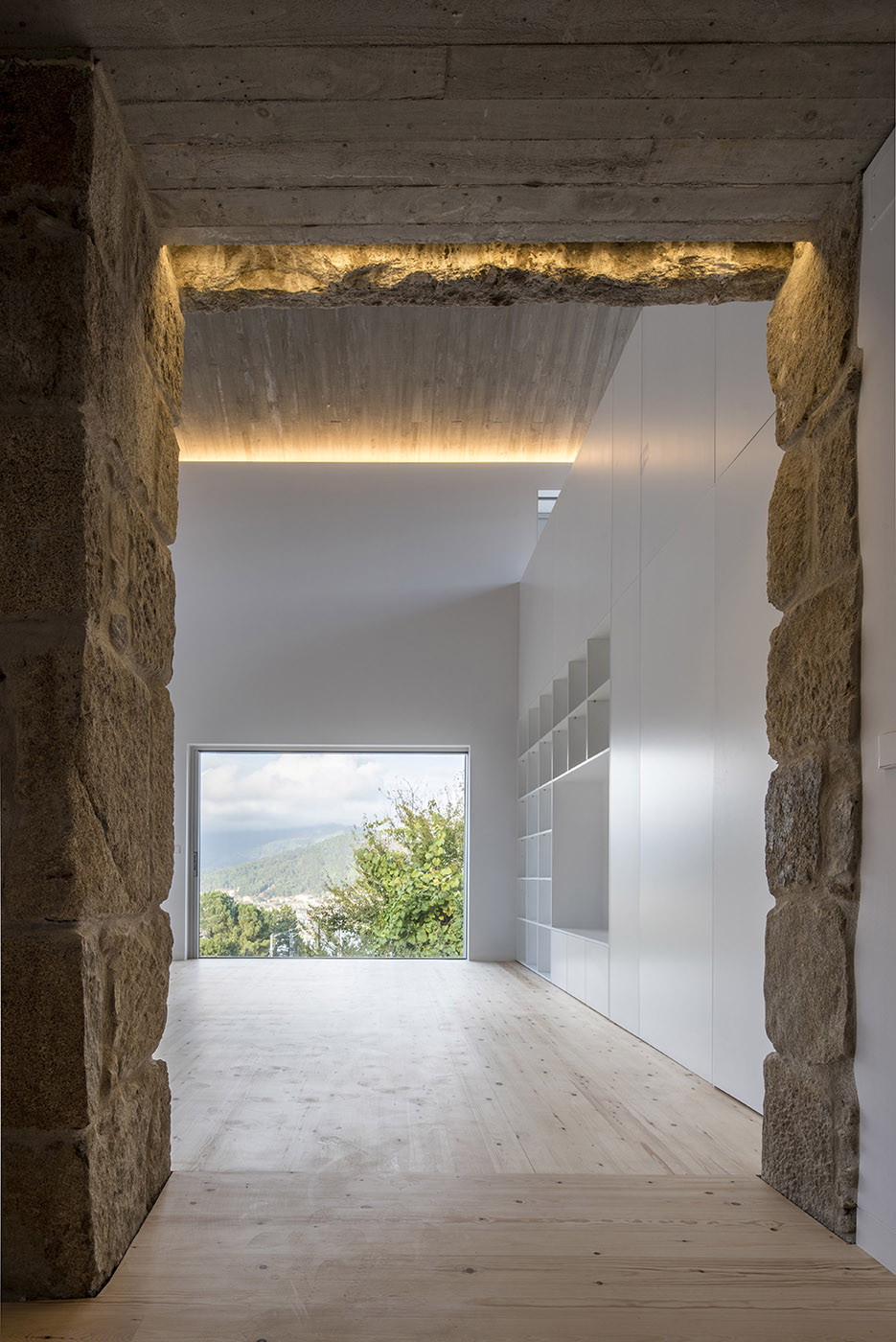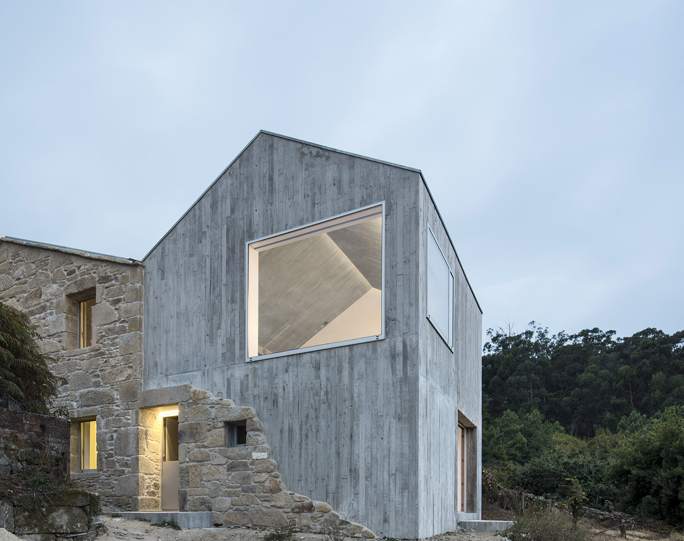 Fuertes Penedo Arquitectos interviene en un pequeño núcleo de naturaleza tradicional, formado por casas de piedra y numerosos graneros. Un volumen de concreto, abierto a las vistas circundantes, reemplaza uno de los tres volúmenes de piedra existentes adyacentes
