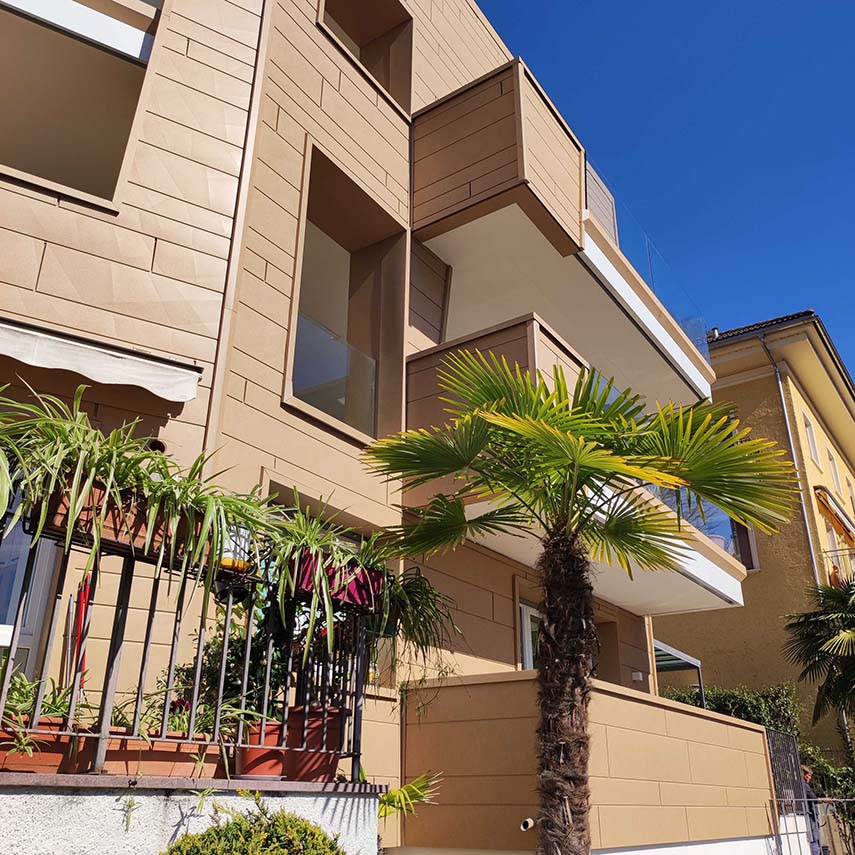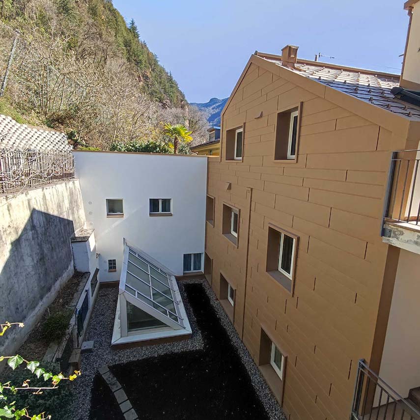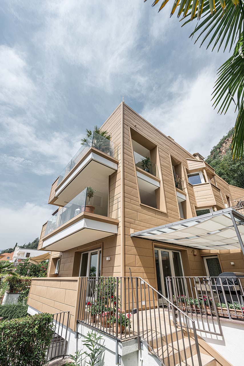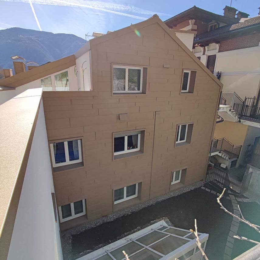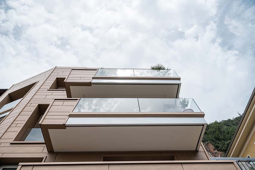 El estudio de proyectos arquitectónicos Valentino Andriolo, con su visión, ha reescrito hábilmente la narrativa que rodeaba esa zona, otorgando al edificio la majestuosa forma de un imponente monolito con fachadas esculpidas de manera irregular y salientes. La fluidez entre la línea del techo y la superficie frontal se ha mantenido magistralmente mediante la eliminación de salientes, creando una sinergia armoniosa entre los elementos horizontales y verticales, entre el cielo y la tierra.