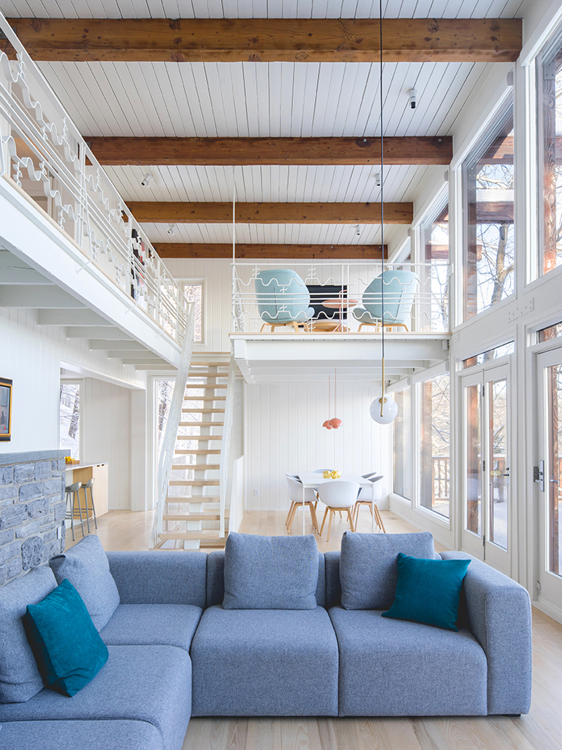 El techo plano se repensó en favor de otro tipo de techo, que recordase mejor su esencia escandinava. En cuanto al interior, el muro de piedra y la balaustrada interna se tratan de forma más contemporánea pero,de todos modos, se conservan