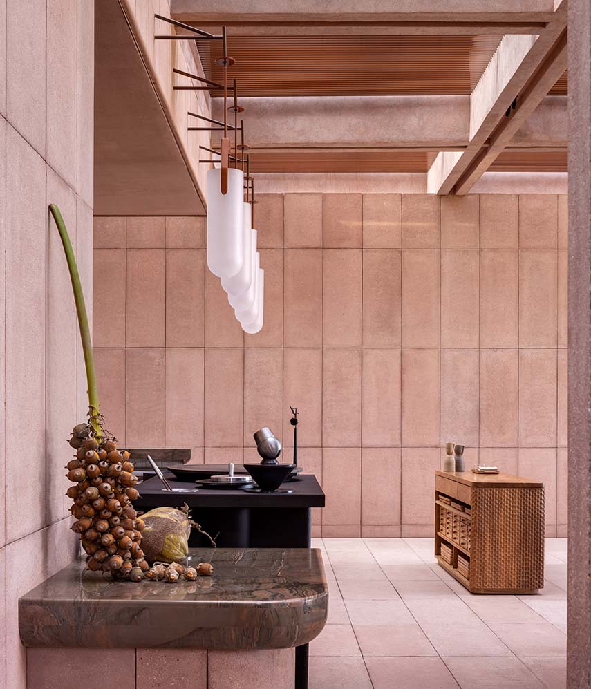 Situado en la península de Punta Mita, en el extremo de la bahía de Banderas, Rubra se alcanza a través de un camino inmerso en la vegetación. El recorrido, ya sea a pie, en bicicleta o en carrito de golf, marca un progresivo distanciamiento del entorno urbanizado. La llegada es intencionalmente enigmática: una fachada ciega que oculta el interior y despierta la curiosidad. Solo al atravesar un túnel bajo y estrecho, se accede repentinamente a la terraza principal, un espacio abierto que se asoma a la Sierra Madre Occidental y al horizonte marino, amplificando la sensación de descubrimiento.