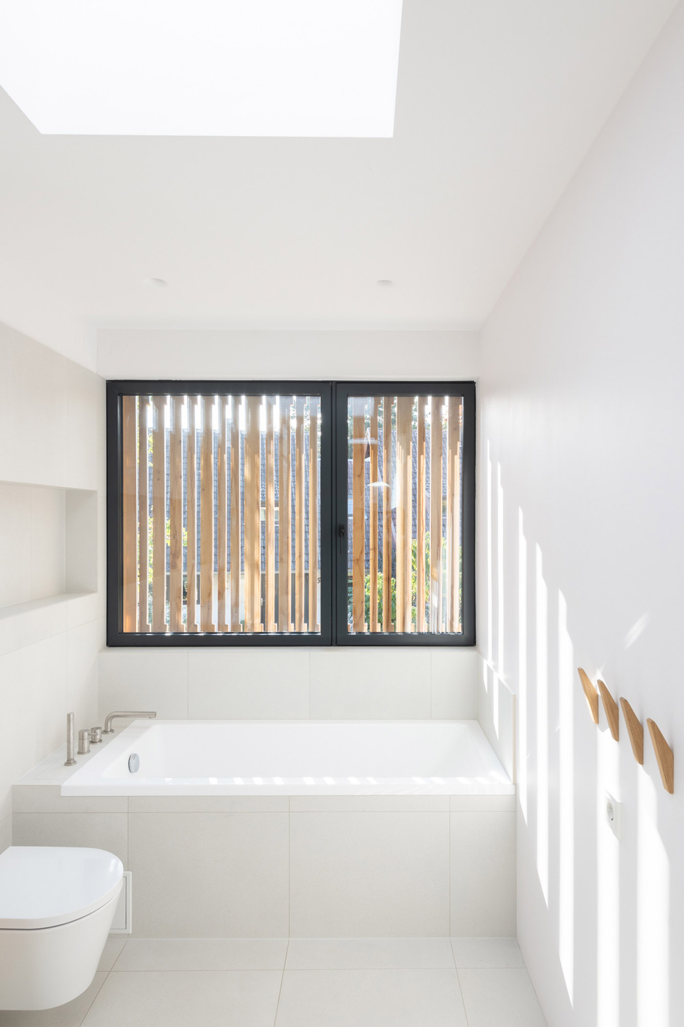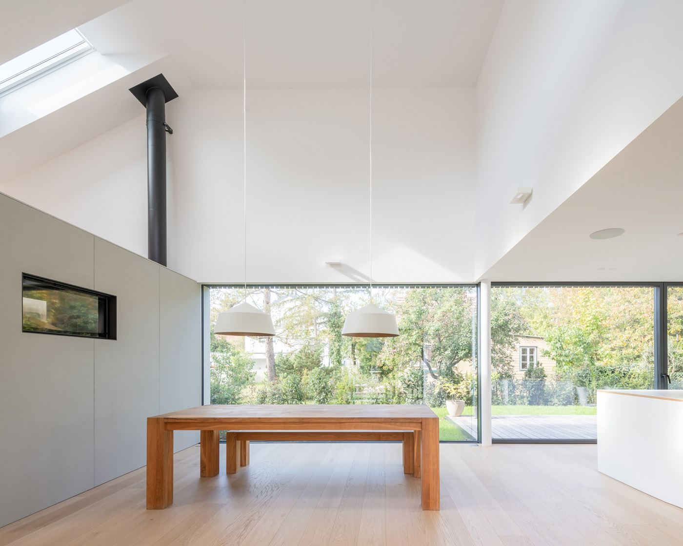 La entrada al edificio desde el nivel de la calle está al sur, seguida de medio tramo de escaleras hacia arriba hasta la espaciosa zona de día a nivel del jardín. La cocina, situada en el centro, se abre totalmente al norte y al oeste, al jardín. En la misma planta hay una zona de trabajo, un lavadero y un baño para invitados. El salón se extiende en dos niveles hasta la planta superior. Una chimenea se sitúa en el centro y se abre, como un mueble independiente, tanto a la zona de comedor como al salón. Las claraboyas situadas sobre el entresuelo permiten que el sol del sur inunde la zona de estar