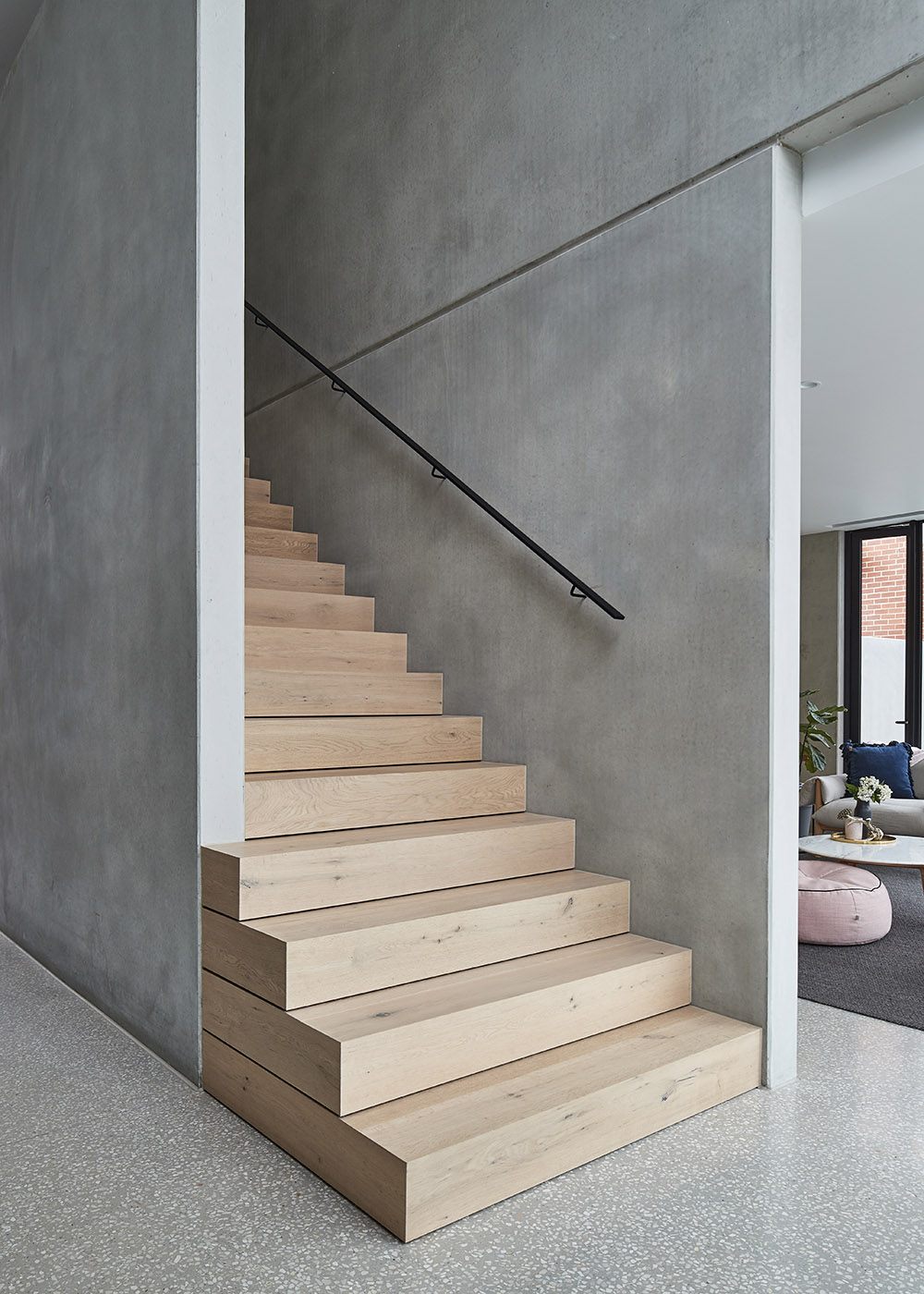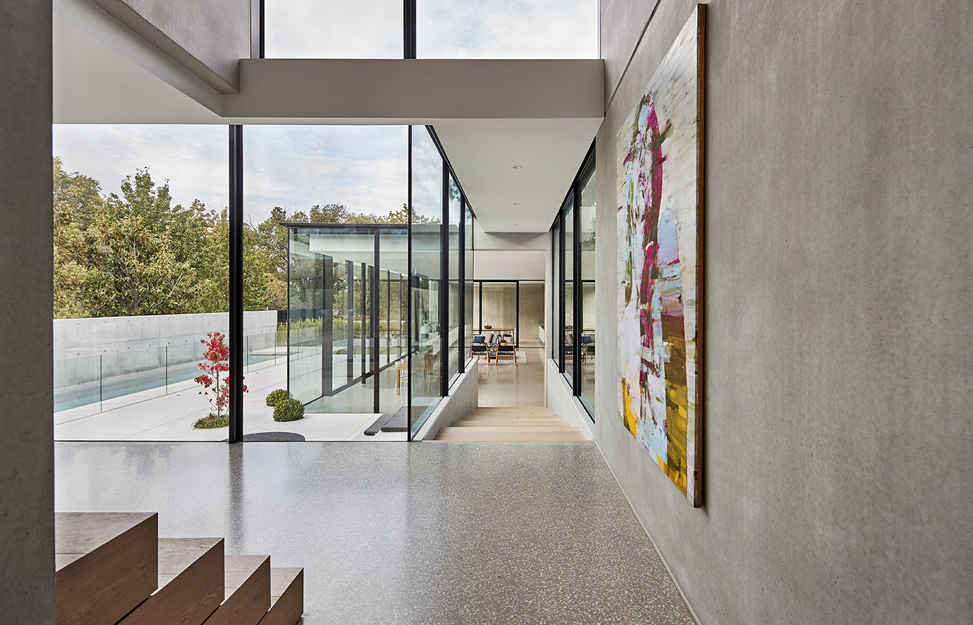 La imponente fachada de Salmon Avenue, en concreto prefabricado, destaca inmediatamente en la calle. Diseñada por FGR Architects, un estudio especializado en proyectos de arquitectura y diseño contemporáneo, la Villa se convierte en un ejemplo simple y brutal de la belleza del concreto crudo. Un fuerte lenguaje de diseño se expresa a través de la combinación de losas sólidas de concreto y vidrio sostenidas por marcos de acero negro.