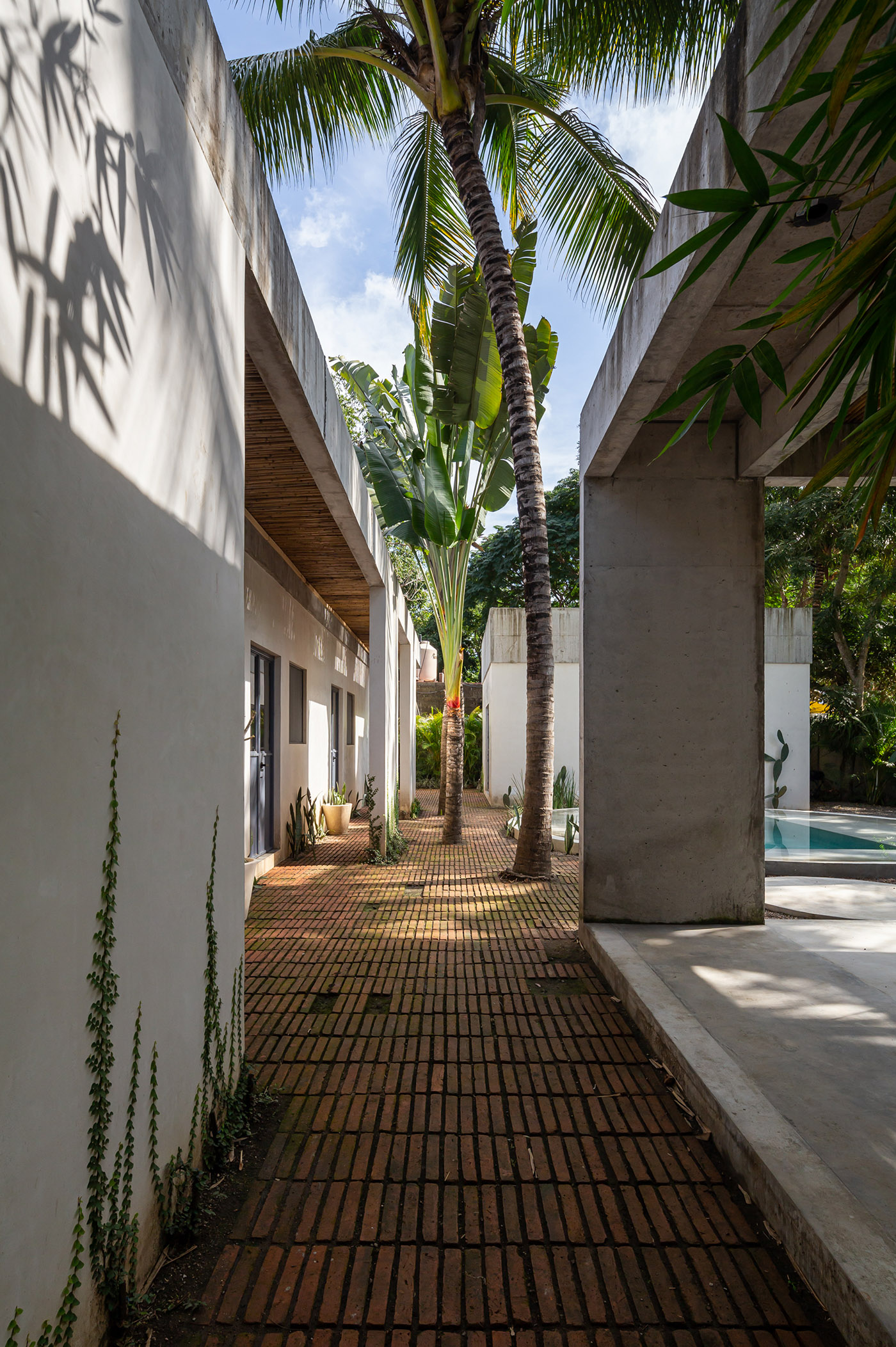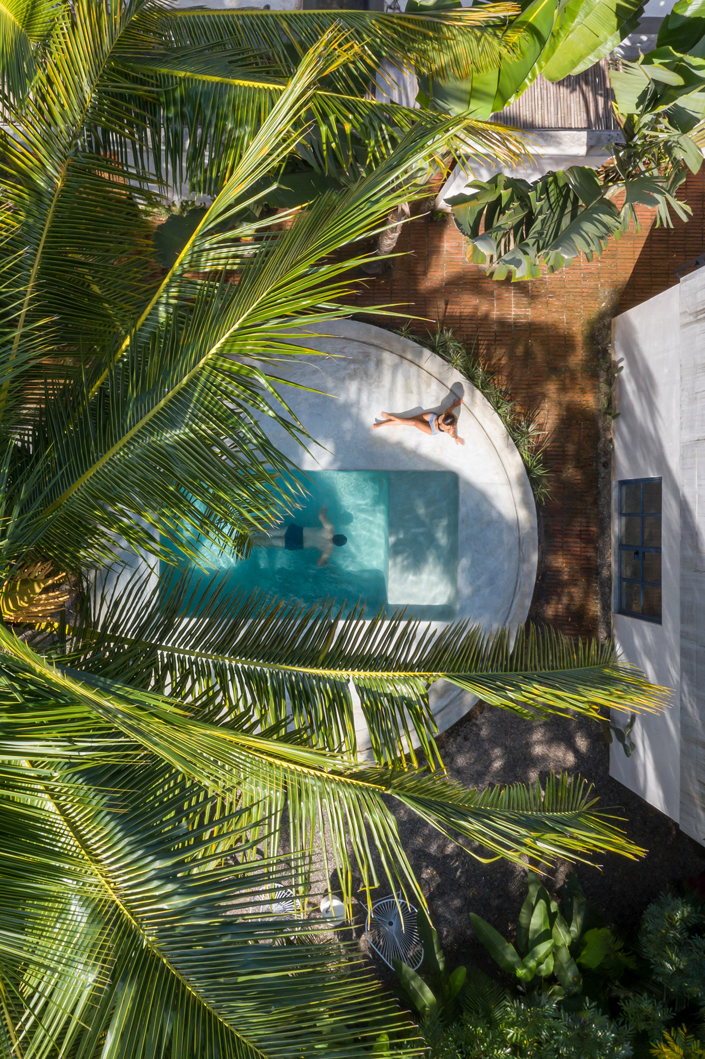 La segunda acción de la requalificación consiste en reconfigurar el espacio abierto central, colocando la piscina en el centro del terreno con el volumen existente al norte y los dos nuevos volúmenes a los lados. Para crear un poco de privacidad entre la zona de la piscina y las habitaciones, se construyen una serie de muros cortos que también definen un porche con techo de bambú que proporciona un poco de sombra.