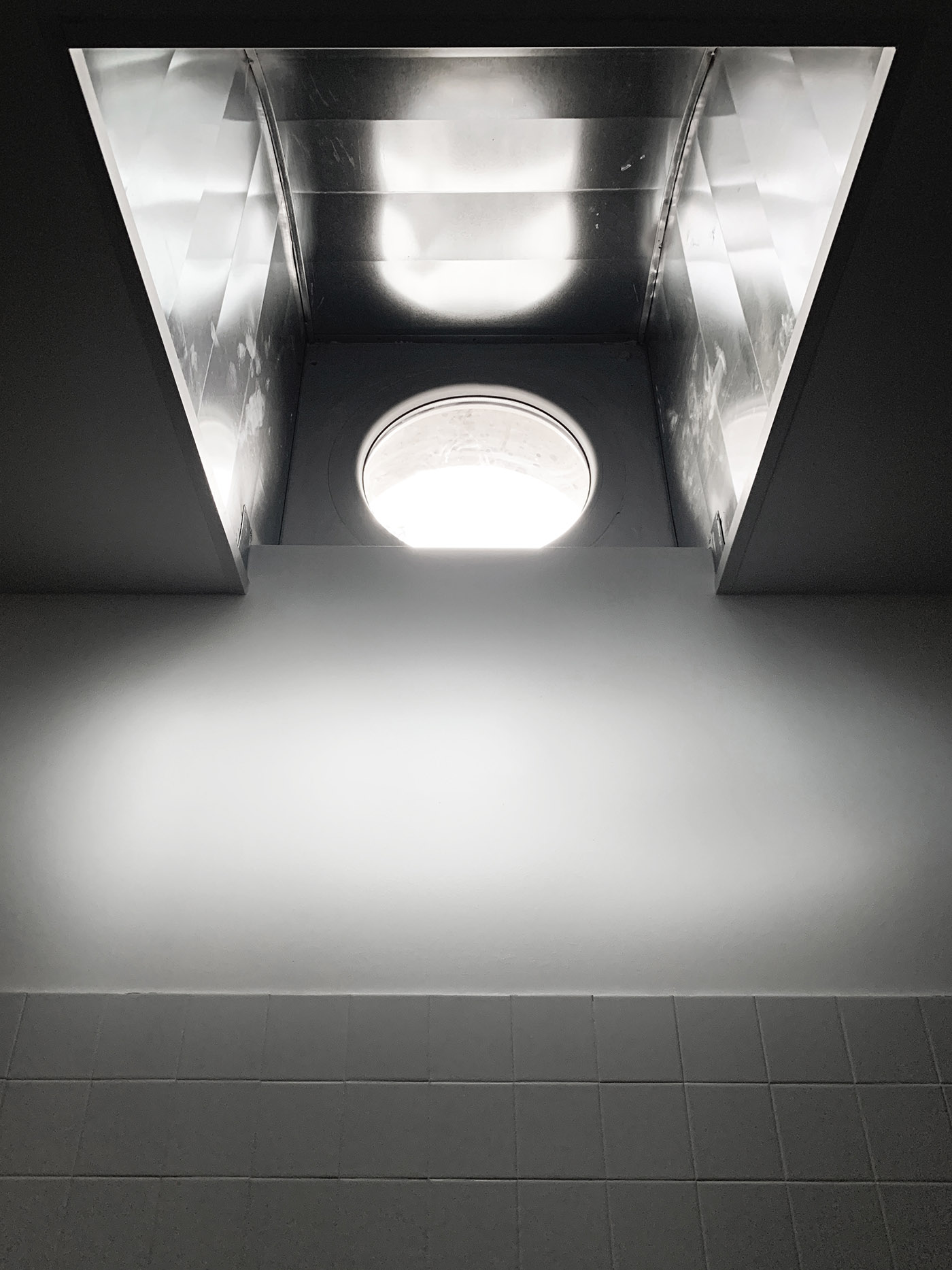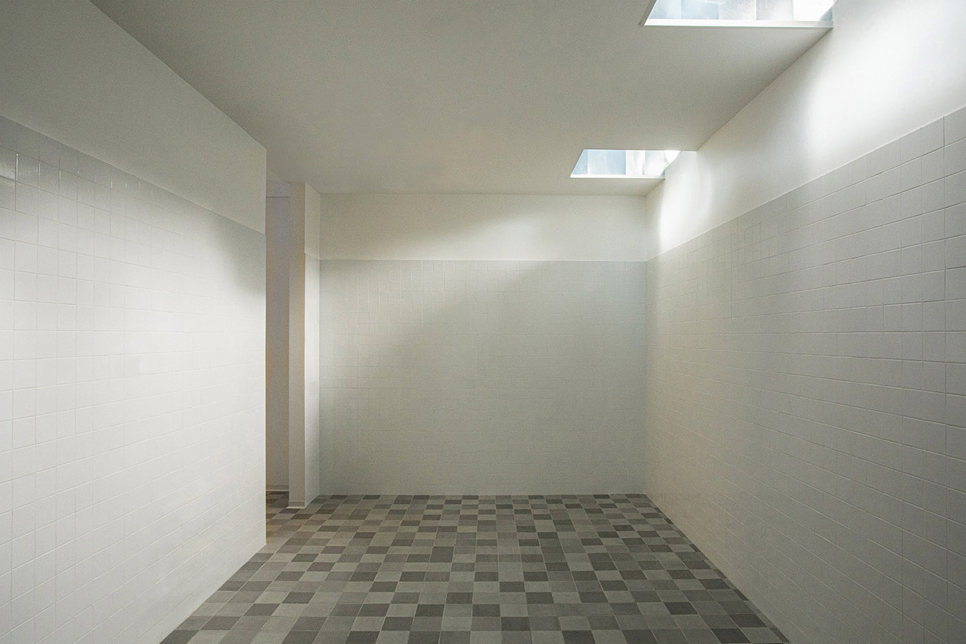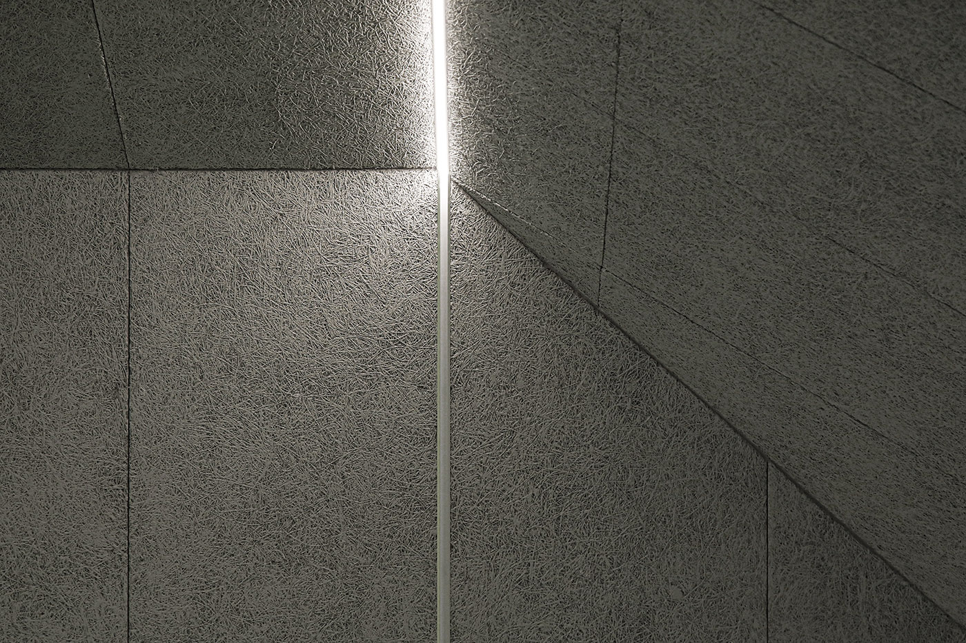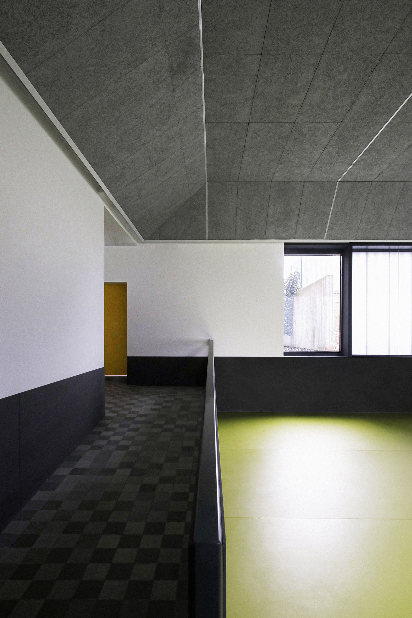 La verdadera peculiaridad de esta intervención radica en la realización de un falso techo acústico sobre el área de juego hecho de Celenit (fibra de madera mineralizada) que alberga en su interior un plano liso plegado en los extremos donde están todos los componentes técnicos: la iluminación, compuesta por tiras LED empotradas, la entrada de aire nuevo mediante difusores lineales en el perímetro del falso techo en la unión con las cristaleras, y cualquier otro dispositivo técnico. La conexión entre el falso techo y la pared, realizada mediante un perfilado metálico, separa completamente el techo de las paredes, acentuando la sensación de levitación