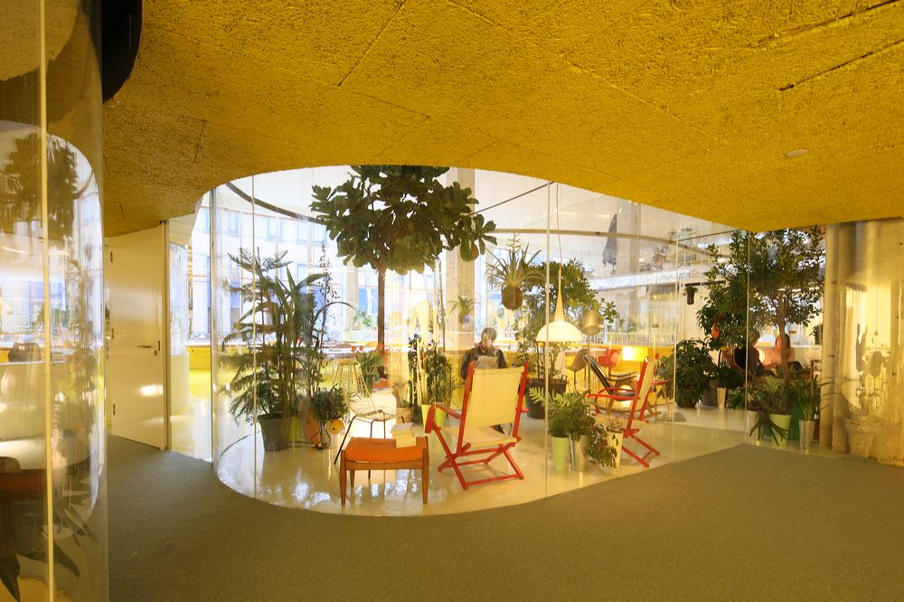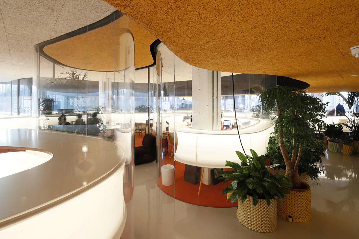 Por lo tanto, se ha eliminado el efecto laforrín típico de las oficinas, que podría generar situaciones complejas, gracias a dos trucos: en primer lugar, con una fluidez visual y física constante que impide que los usuarios se sientan perdidos o atascados en un lugar en particular y en segundo lugar, con un control total sobre la acústica con la ayuda de alfombras y techos absorbentes. Esto también fue posible gracias a los paneles de aislamiento Celenit AB, hechos de fina lana de abeto, que fue mineralizada y unida con el cemento utilizado en el falso techo, que produjo una forma continua y curvada que dispersa el sonido y la vista en todas las direcciones