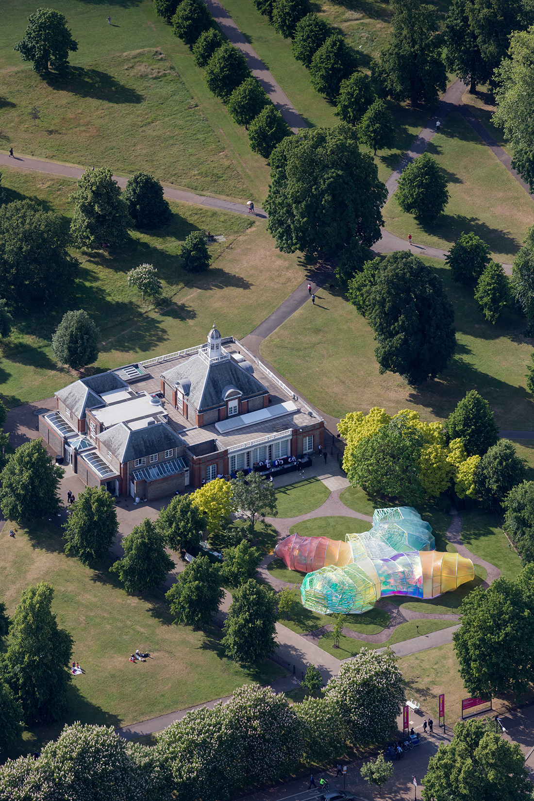 Selgascano diseña un pabellón totalmente de plexiglás en Londres, en el que la estructura rígida serpentea sobre el verde parque de Royal Park y su movimiento está diseñado por la luz que filtra y las sombras que regresan. La arquitectura se vive como una experiencia