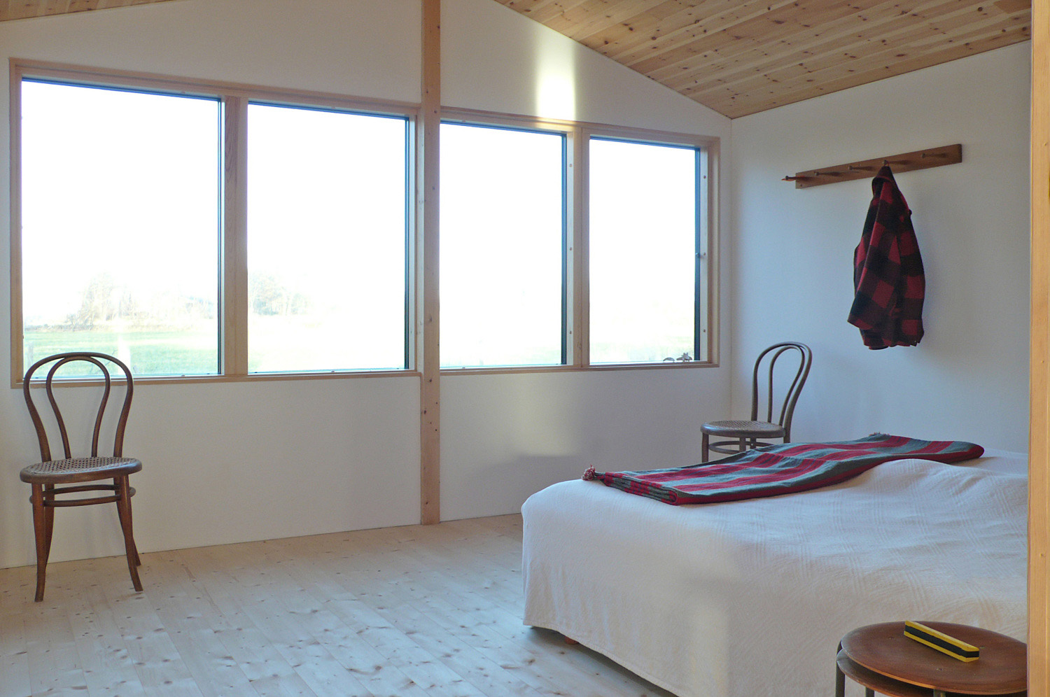 Se agrega un amplio dormitorio con vista. Todo el edificio fuerecubierto de madera, con paneles de alerce, mientras que el techo es de aluminio. Los perfiles de las ventanas y la chapa provienen del trabajo del aluminio reciclado