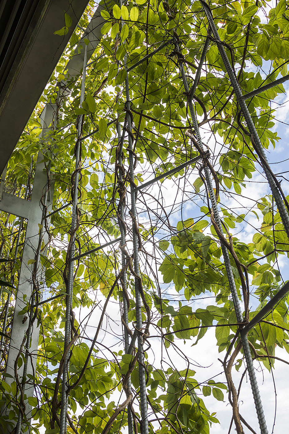 El vacío que se abre en diagonal hacia arriba aporta ventilación natural a la casa, gracias al efecto chimenea. Así se reduce al mínimo el uso de aires acondicionados. Paseando por el espacio, se sentirá el viento pasar de la sala de estar a la planta superior de la casa. La fachada verde atenúa el intenso sol del clima tropical. Este modelo se convierte así en un precedente para la construcción de viviendas en climas tropicales