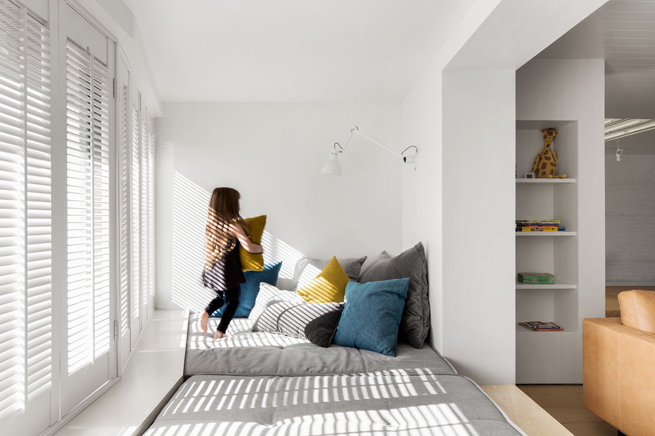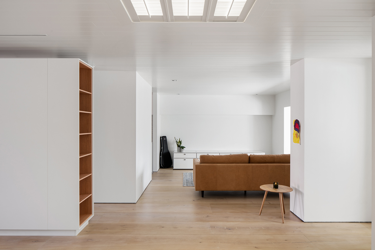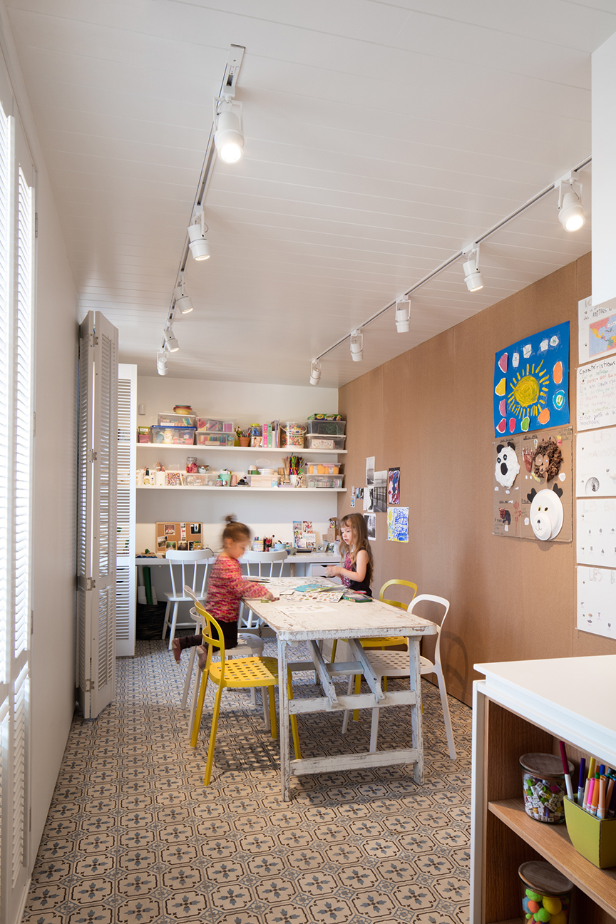 Para integrar los rituales cotidianos del cuidado de los niños en los complejos horarios de trabajo, el arquitecto Alain Carle concibió con sus colaboradores un espacio en el que la vida profesional no excluye la vida familiar. El espacio interior del apartamento está completamente reestructurado para crear un espacio abierto y versátil