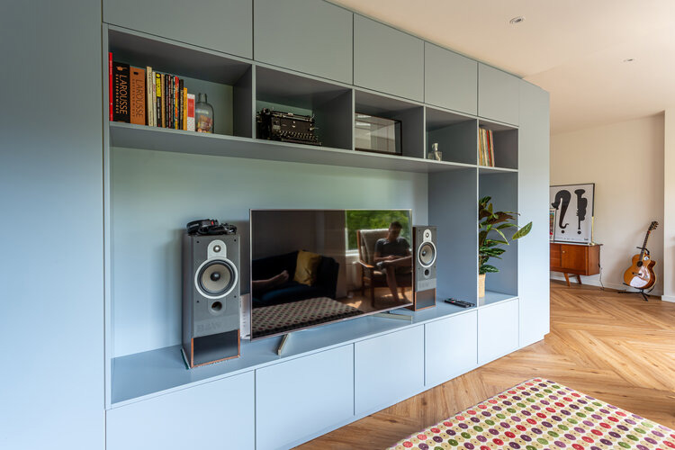 El deseo del cliente era el de crear un espacio íntimo en el que relajarse, que al mismo tiempo sirviera de espacio de almacenamiento y exposición. El deseo de diseño se tradujo en la adición de un bloque, un espacio vital abierto que sirve para varias actividades cotidianas