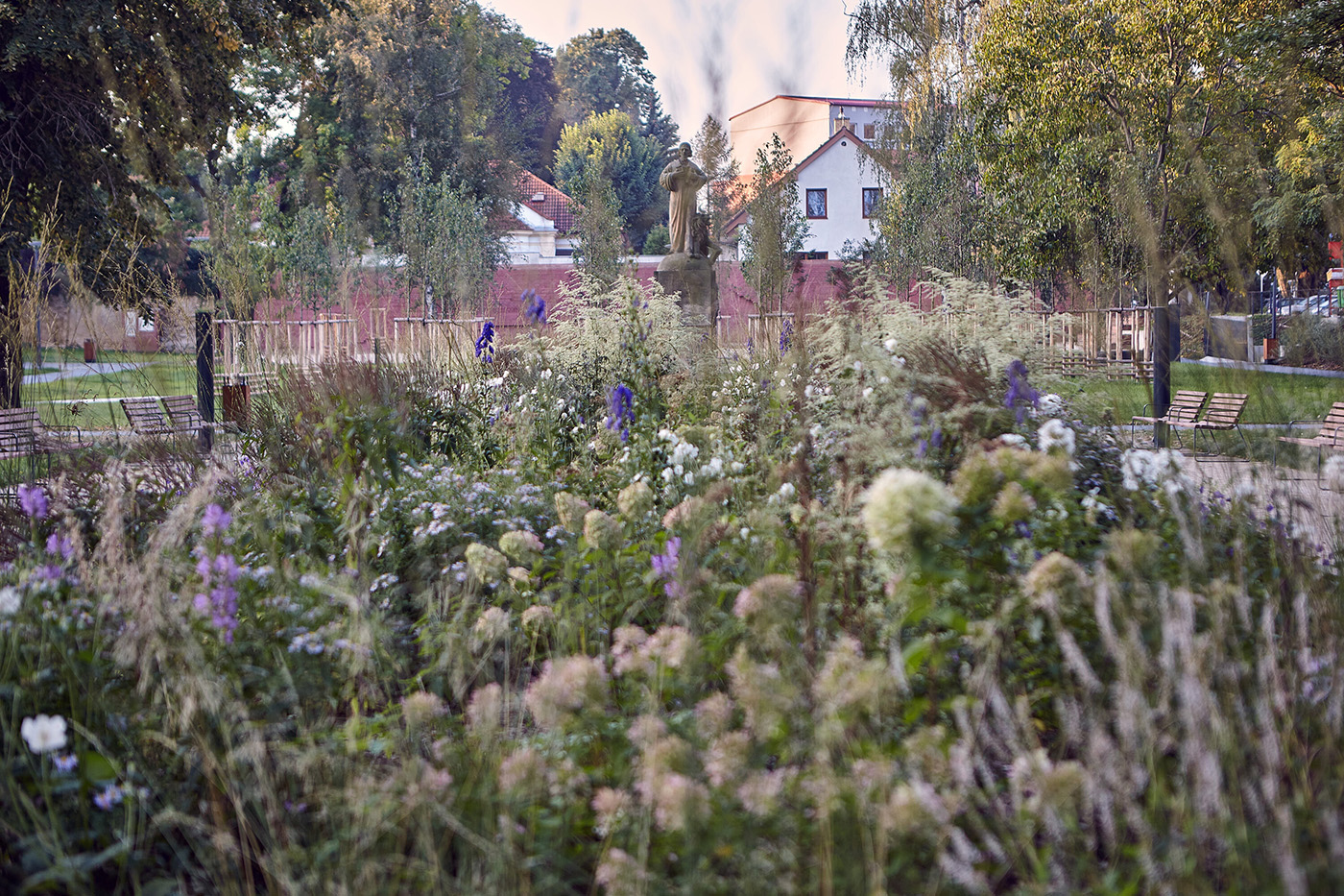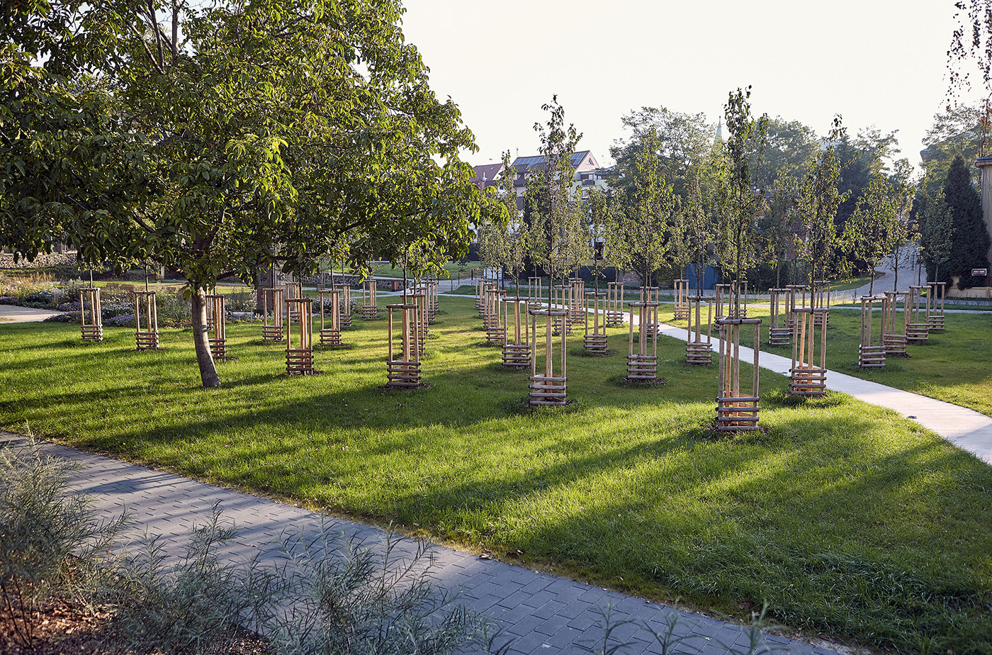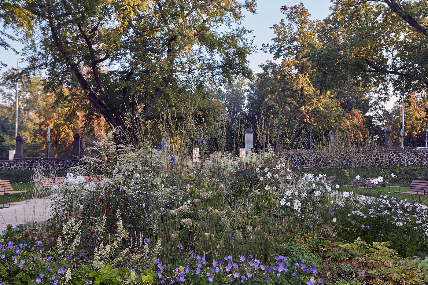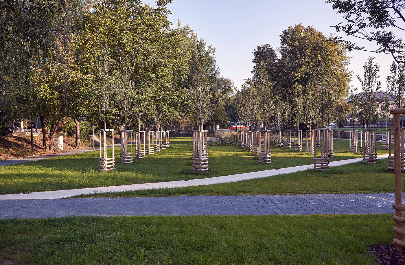 El lugar que ahora alberga la escultura albergaba históricamente una aldea verde con un lago, que durante la época de la Primera República Checoslovaca fue desecado y convertido en un parque, reconstruido recientemente por el estudio paisajístico Land05, dirigido por Martina Forejtová. Durante las adaptaciones de la construcción de la época, se demolieron las casas que bordeaban el lago original. Los restos de los tímpanos de los techos de estos edificios aún eran visibles hasta la reciente reconstrucción de 2019-2020. Studio SKULL fue invitado a participar en el diseño del muro perimetral del límite sur del parque