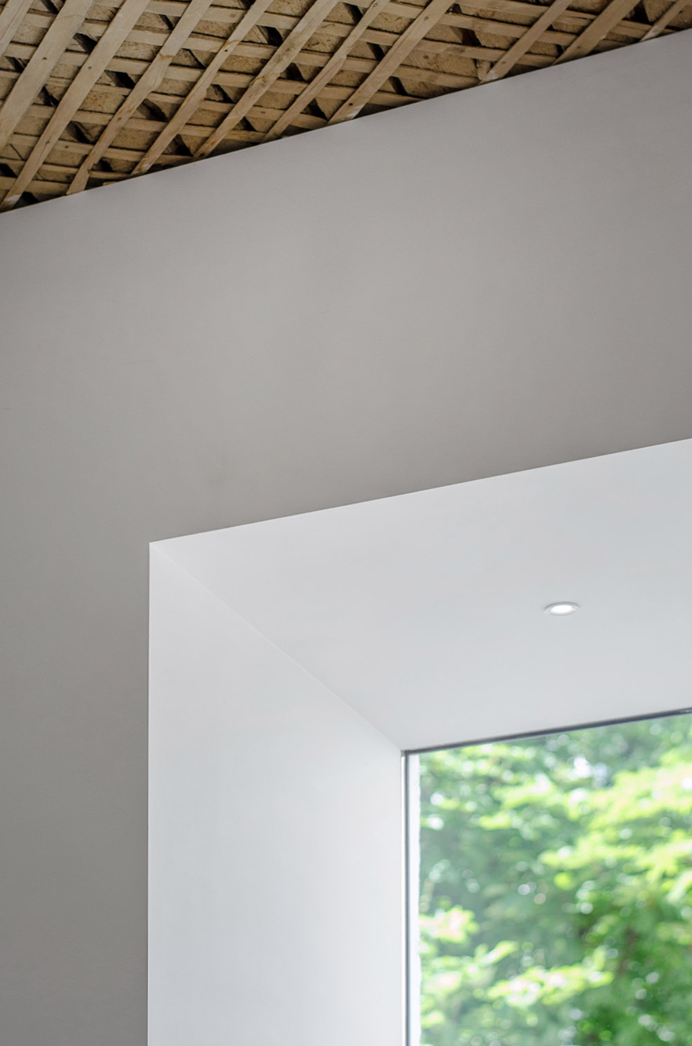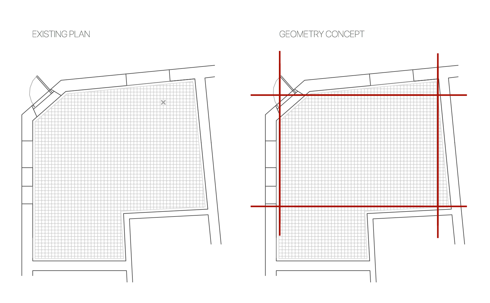 Ante la complejidad e irregularidad geométrica de la planta, los arquitectos decidieron basar su diseño en el eje de las líneas paralelas y perpendiculares del suelo, instalando ventanas de cristal sin marcos montadas en paredes enderezadas con placas de cartón yeso
