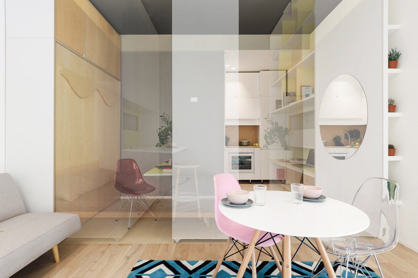 TAAAC Apartment es una casa que cambia mágicamente de forma, que nunca se repite, como una flor que se abre y se cierra según la hora del día y la luz natural. El mobiliario, además de ser tal, también es una serie de elementos útiles de almacenamiento y funcionales, creando un espacio extremadamente versátil