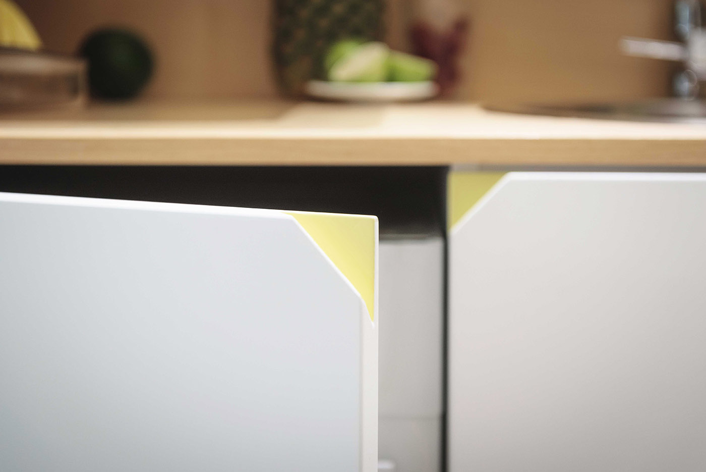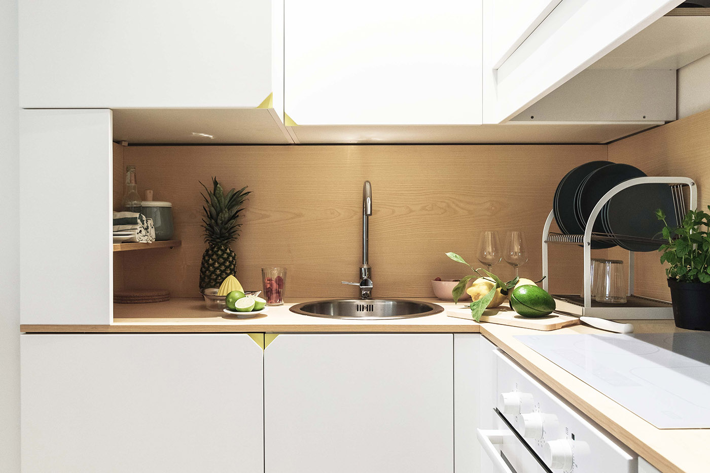 Los armarios fijos contienen las zonas de servicio y las distintas funciones, como el almacén, la lavandería, la cocina y la cama, mientras que los armarios móviles contienen las distintas funciones temporales, como la zona de estudio, la mesa para el desayuno o comidas rápidas y el armario