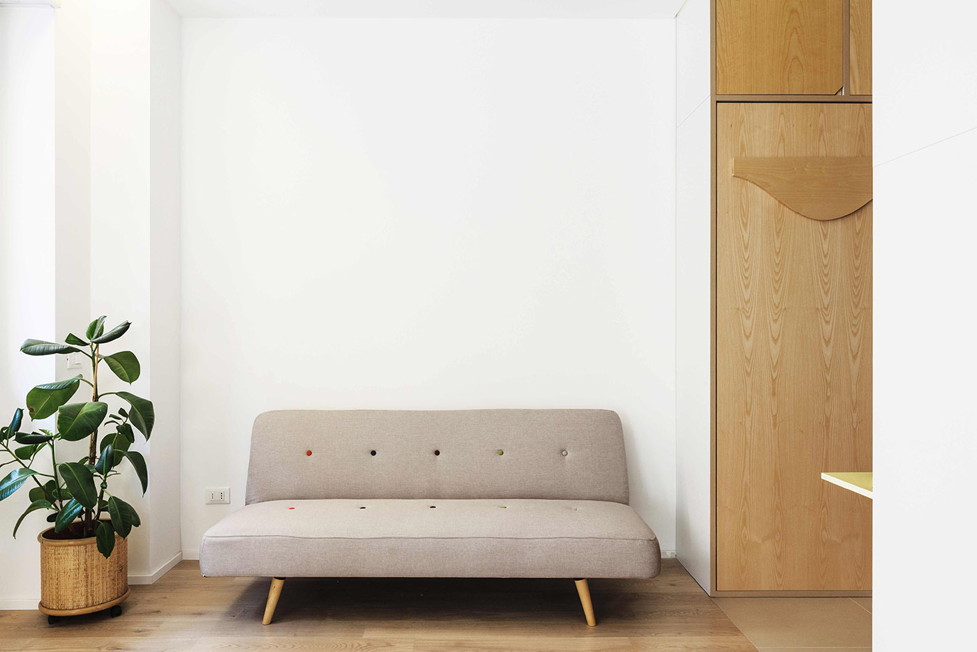 La propiedad está situada en una zona muy turística de Milán y está en el mercado para estancias de corta y media duración. En su proyecto, ATOMAA identifica algunos puntos fijos, como la posición de la cocina, la entrada y el baño, situados en los bordes del espacio principal, lejos de la luz procedente de las grandes ventanas