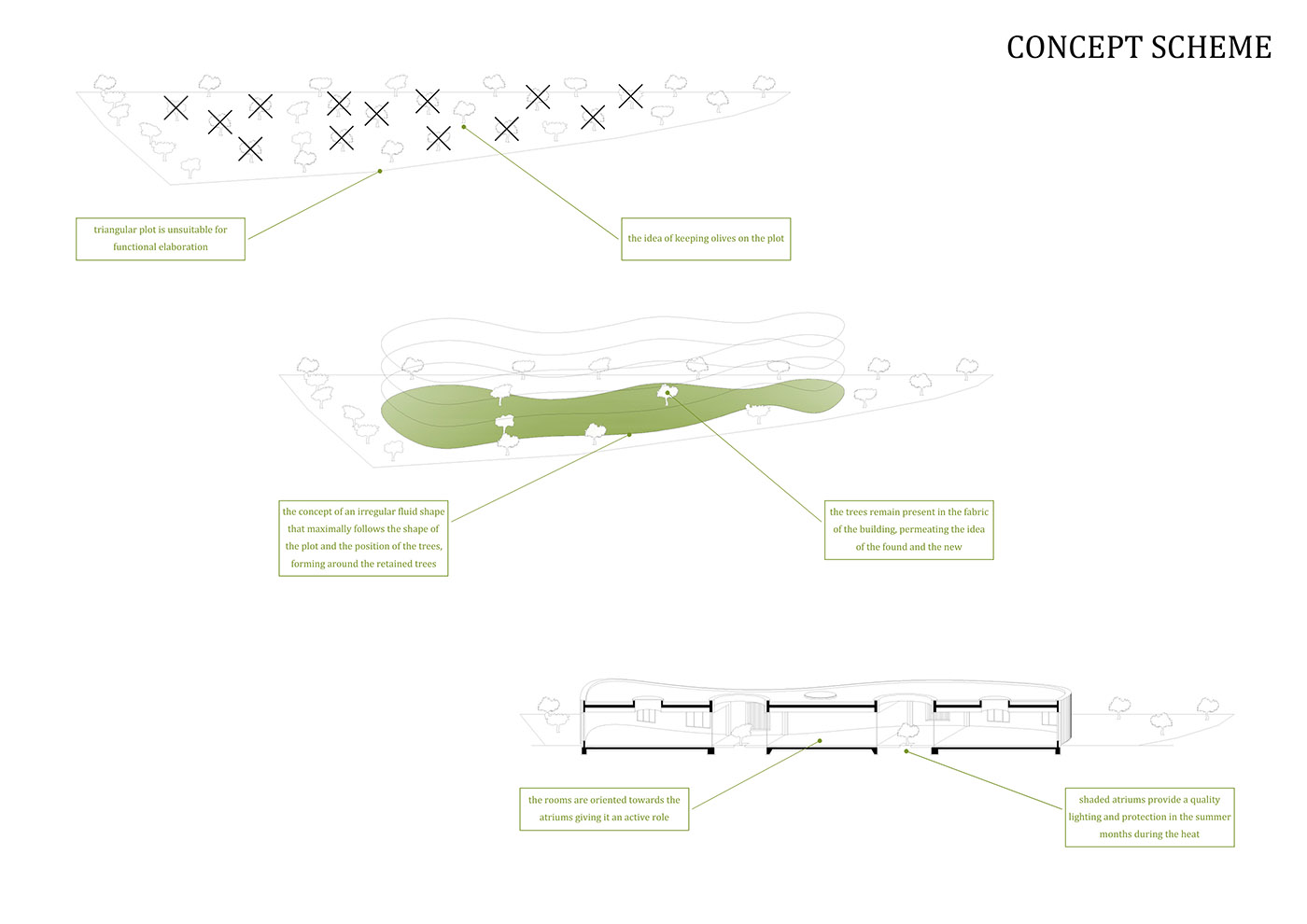 Los arquitectos de PROARH han tenido que trabajar en un terreno triangular, todo un reto para crear un edificio con una distribución funcional. Sin embargo, la idea de preservar los olivos de la parcela orienta el diseño hacia una forma irregular y fluida que se adapta a la parcela e incorpora los árboles en su interior