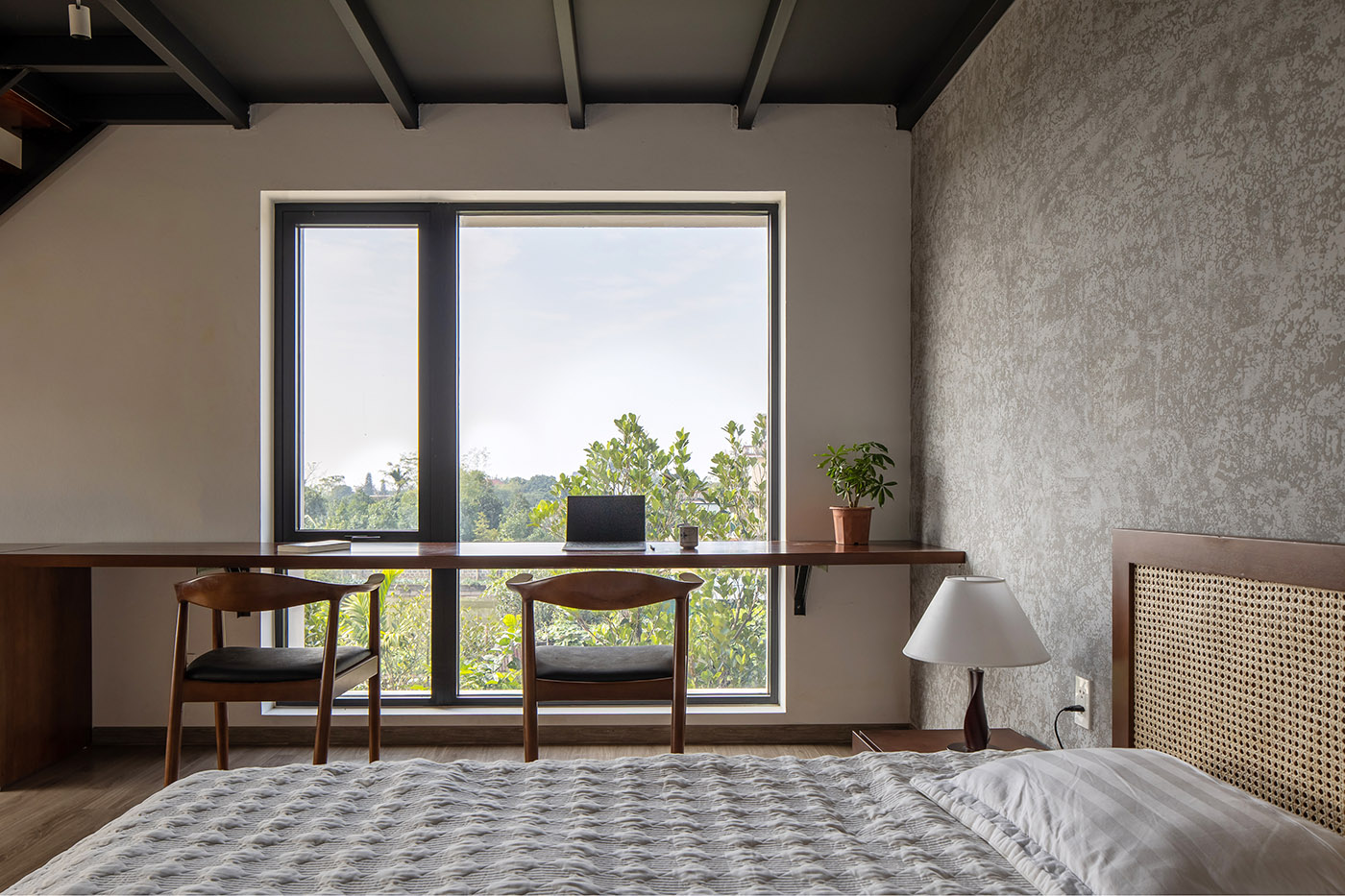 El uso de "persianas tipo árbol" para bloquear el sol y la radiación ayuda a regular mejor la temperatura a la vez que proporciona ventilación, suaviza el espacio arquitectónico y ayuda a las personas a conectar con la naturaleza. La necesidad de conectar la casa con un gran patio que garantice una amplia vista llevó al equipo a utilizar un sistema de puertas giratorias de madera con máxima capacidad de apertura