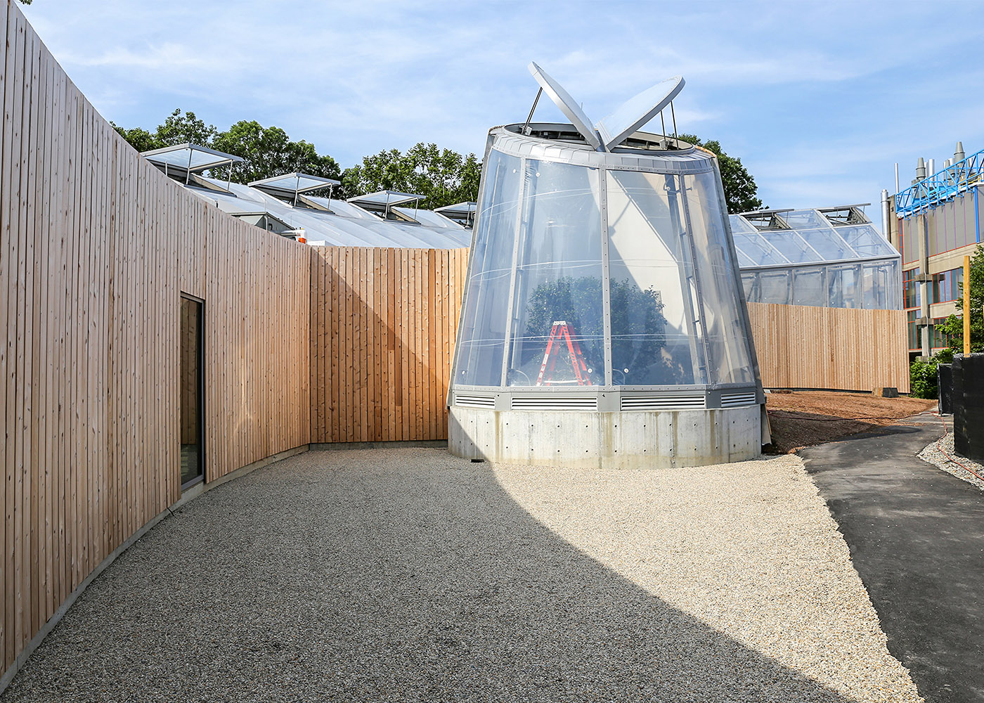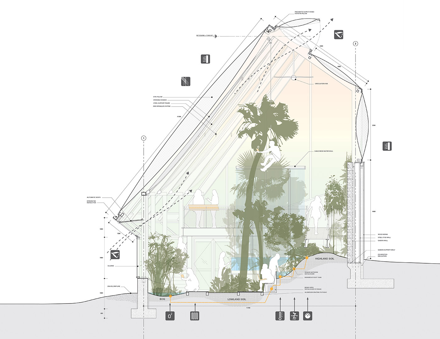 La arquitectura integra innovadores sistemas pasivos y activos sostenibles para cumplir los criterios Net Zero Water del LivingBuildingChallenge, maximizando la ganancia de calor solar en invierno que se capta a través de la masa térmica de un muro. En verano, la piel ecológica de ETFE permite una refrigeración completa de los biomas a través de la ventilación natural