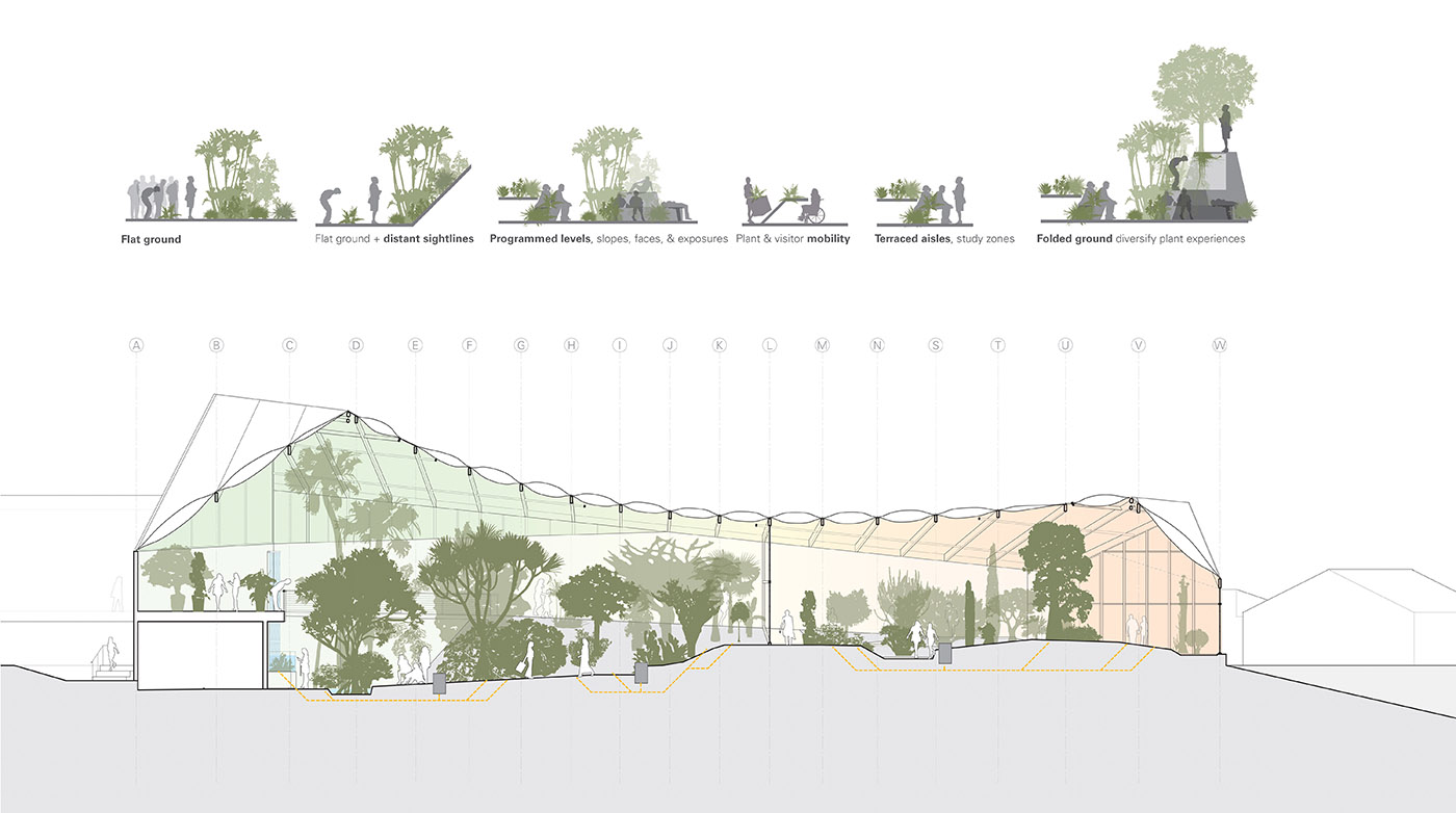 "El proyecto Global Flora es el primer invernadero diseñado en sección vertical", afirmó la arquitecta Sheila Kennedy, FAIA, directora de KVA Matx. "La necesidad de acomodar árboles de diferentes alturas produce un espacio interior dinámico y variable que funciona en conjunto con el terreno configurado de la topografía del sitio. Esto proporciona diferentes experiencias espaciales de manera que las plantas se revelen a medida que las personas se muevan lentamente por los biomas"