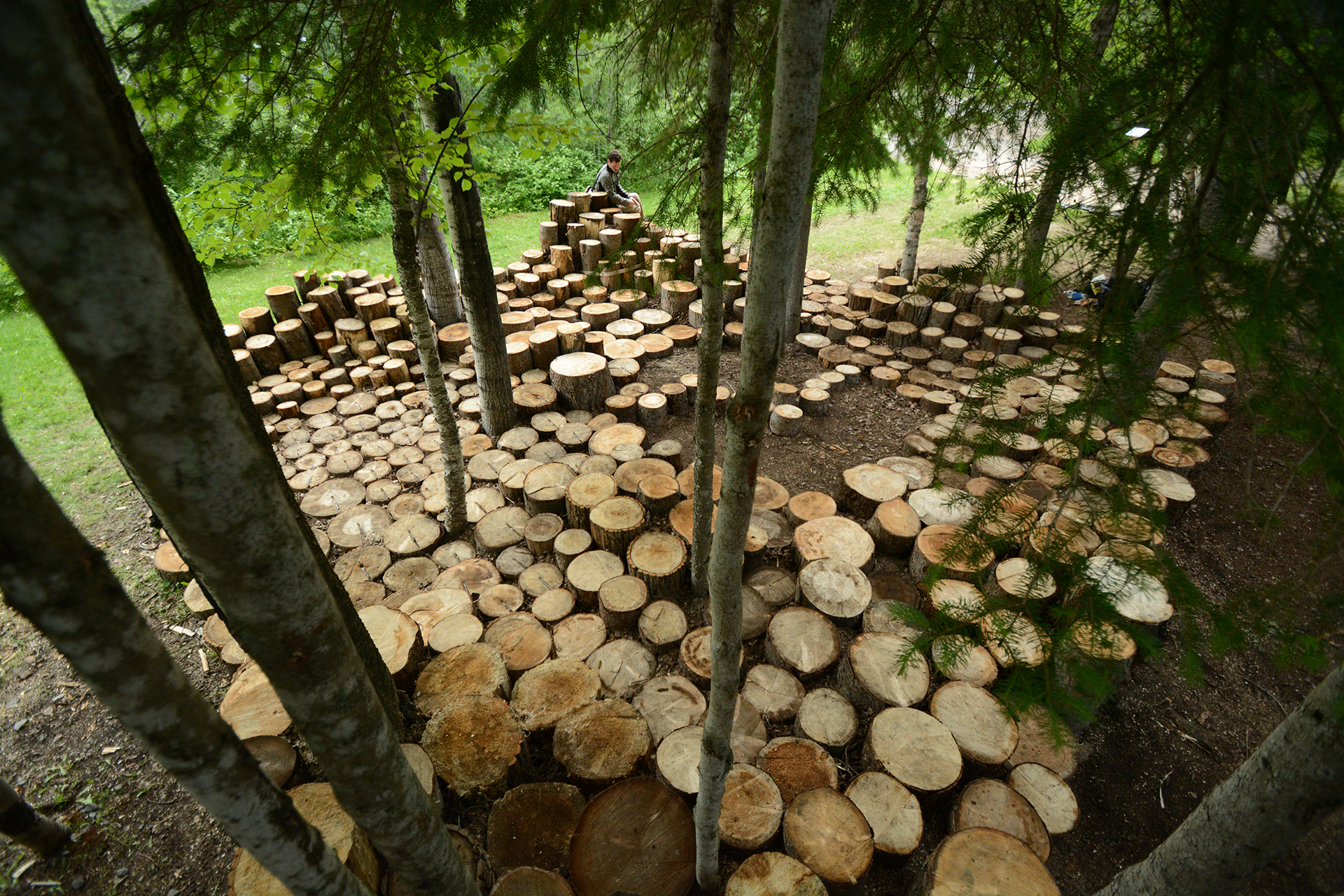 L'assemblaggio denso e verticale di tronchi di legno di varie altezze che si estendono su una superficie di 64 m2 offre una nuova topografia e definisce uno spazio accessibile a tutti coloro che solleticano l'immaginazione