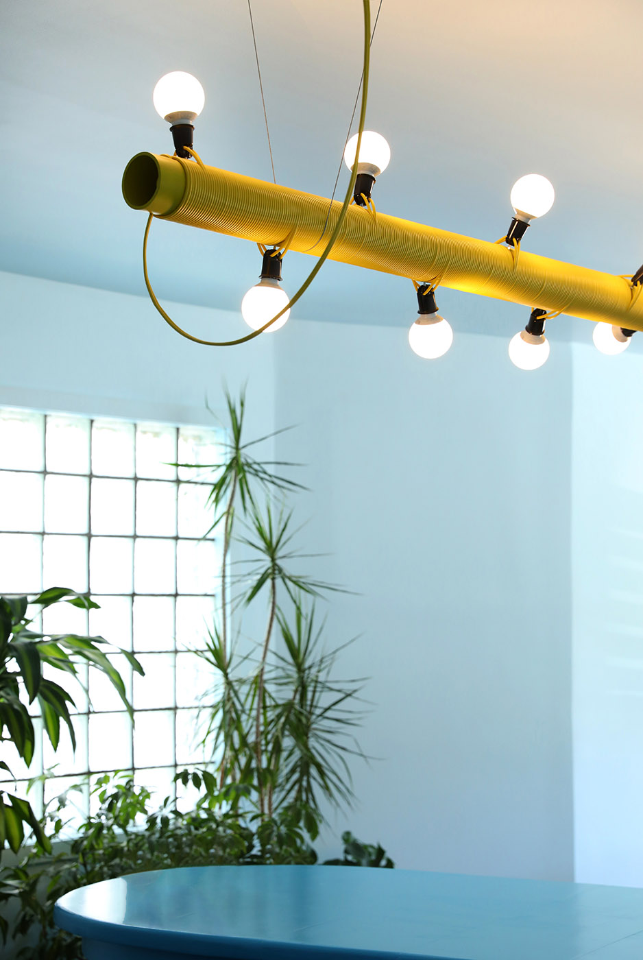 Las tres luces lineales hechas a medida sobre la barra y los bancos se componen de bombillas con cable amarillo fluorescente envuelto en un tubo de aluminio, creando un divertido contraste de color. El diseño se complementa con el uso de exuberantes plantas en maceta, que aportan las connotaciones de los climas más tropicales, y también mejoran la calidad del aire y la acústica del espacio