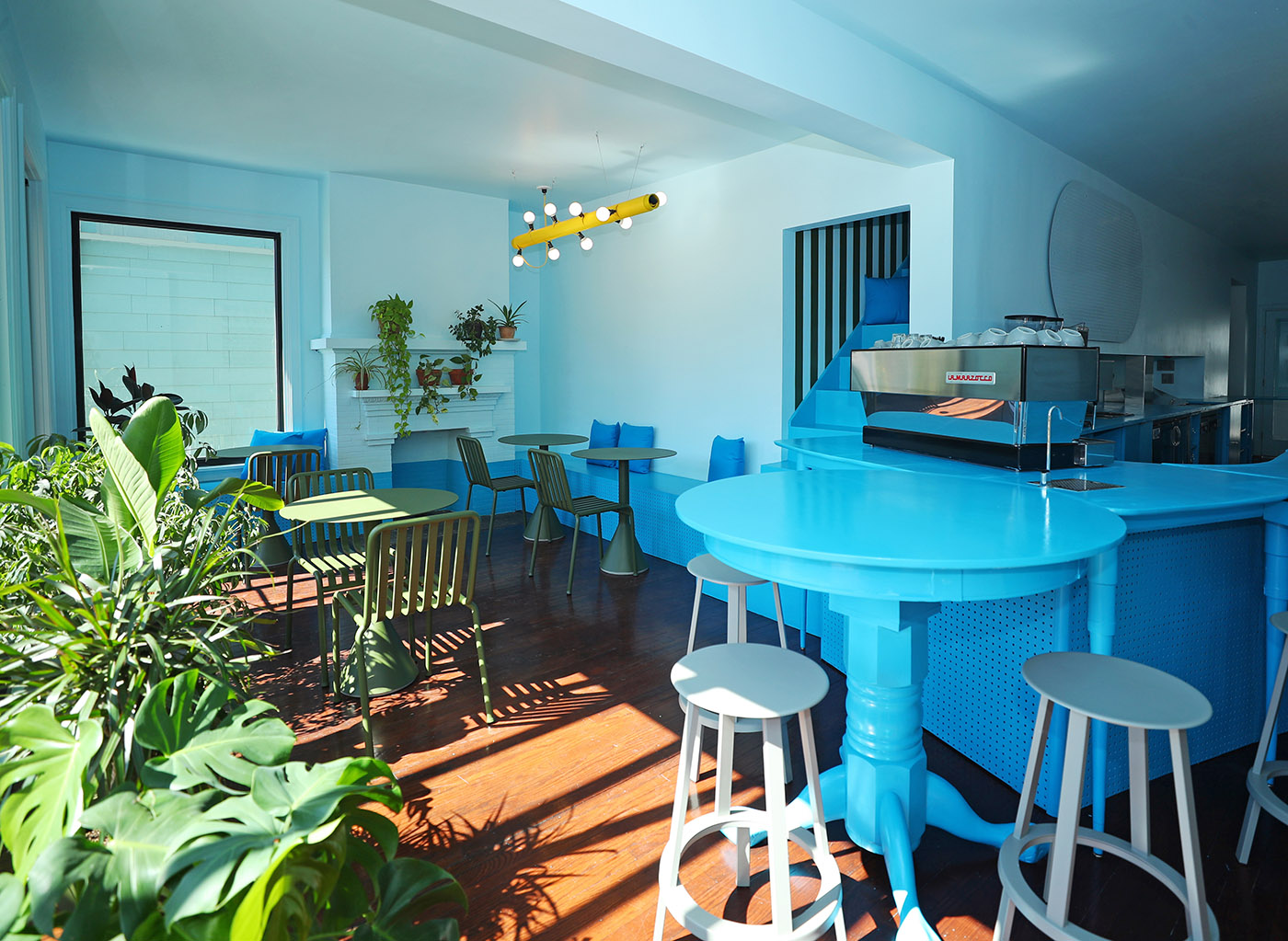 Típico café neoyorquino. Mesas recicladas forman un mostrador azul que maximiza las interacciones sociales
