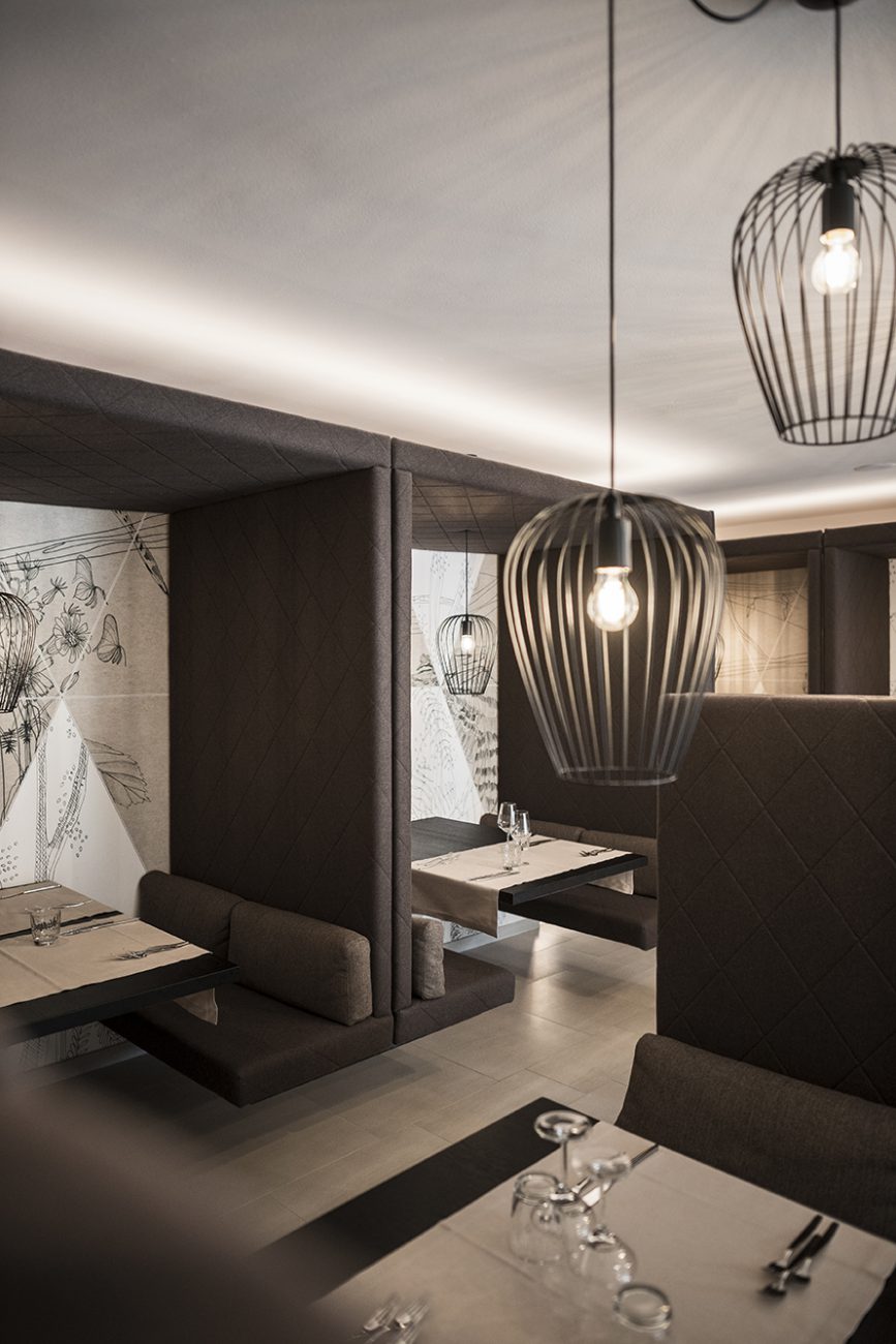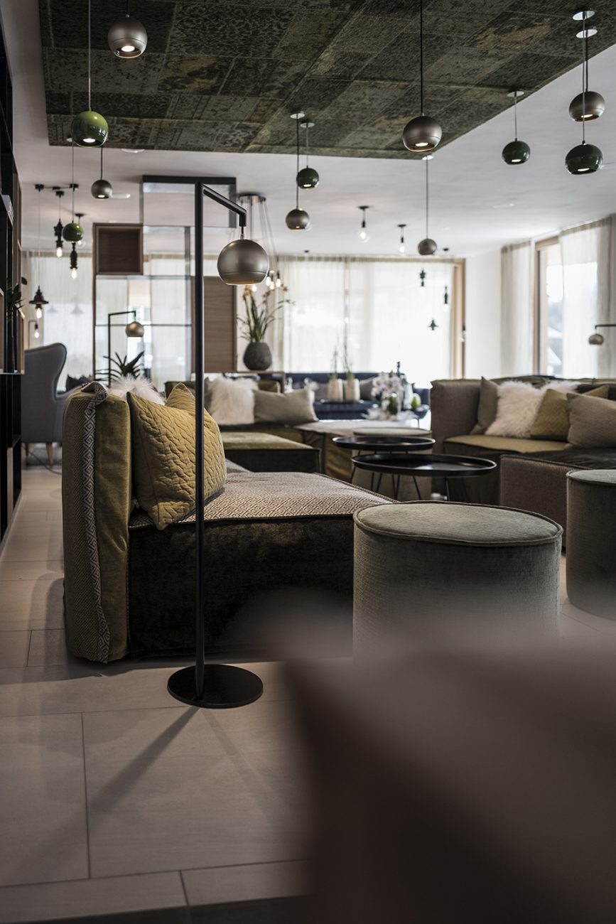 La circulación de todo el hotel toma la forma de una "vía ferrata" idealista que puede recorrer el huésped. La naturaleza y las montañas se convierten en un escenario para diversas actividades y entretenimiento. En la planta baja, por ejemplo, hay salones y restaurantes que se alternan con destellos del Valle de Badia: los muebles en diferentes tonos de azul, verde y marrón recuerdan pastos alpinos, biotopos, bosques cubiertos de musgo y cuevas