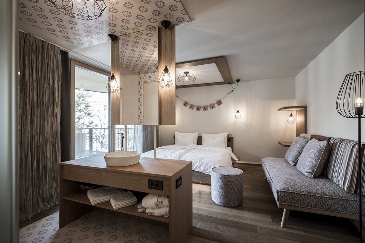 De la estación al valle, la recepción con la cabina de un teleférico comienza la subida - "vía ferrata" - que conduce a los diferentes pisos donde, a diferentes altitudes, corresponden diferentes tipos de habitaciones y suites, hasta llegar a la cumbre donde el huésped puede relajarse en la zona de bienestar y relajación con una espléndida vista hacia las Dolomitas