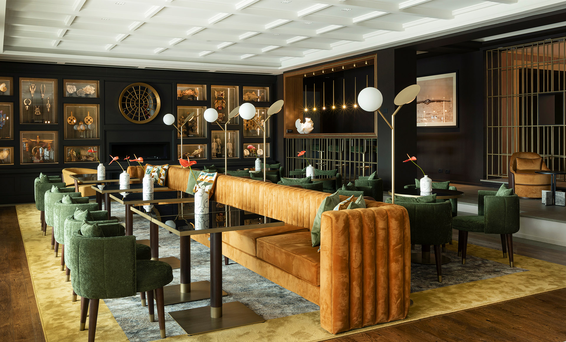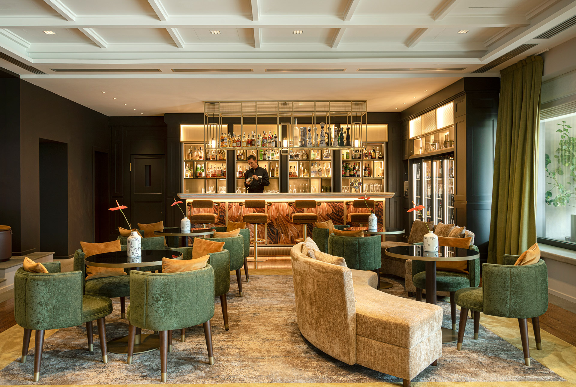 El diseño de Castelfalfi interpreta el escenario de un viaje único hecho de emociones, historia y cultura, entre el territorio y el mundo. En todas las zonas comunes se han recreado espacios fluidos y acogedores en los que pasar el tiempo. La distribución es abierta y sigue lo preexistente, pero gracias al mobiliario, los efectos luminosos y las elecciones cromáticas, se descubren verdaderas islas de descanso, cada una distinta de la otra, tanto en términos de diseño como de función, pero unidas por una narrativa más amplia y envolvente