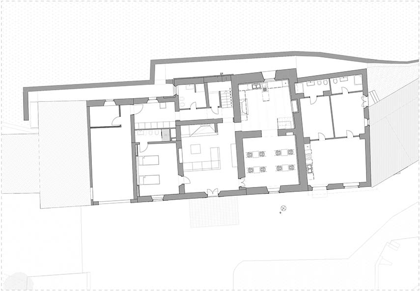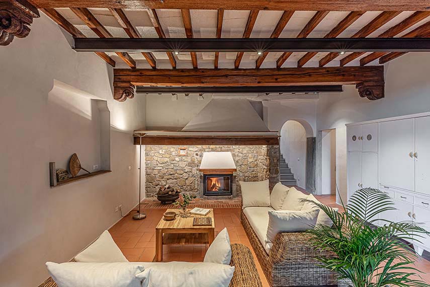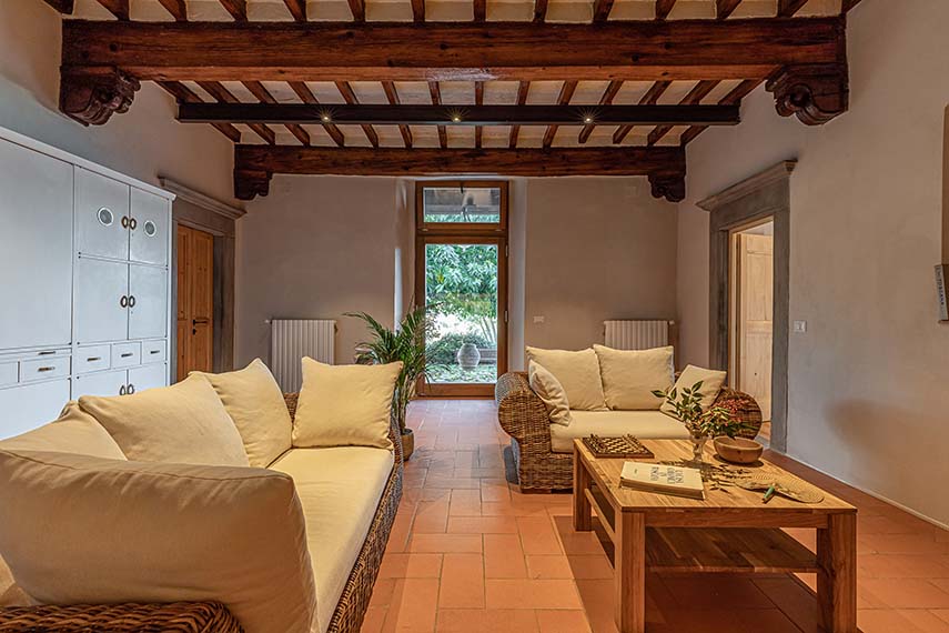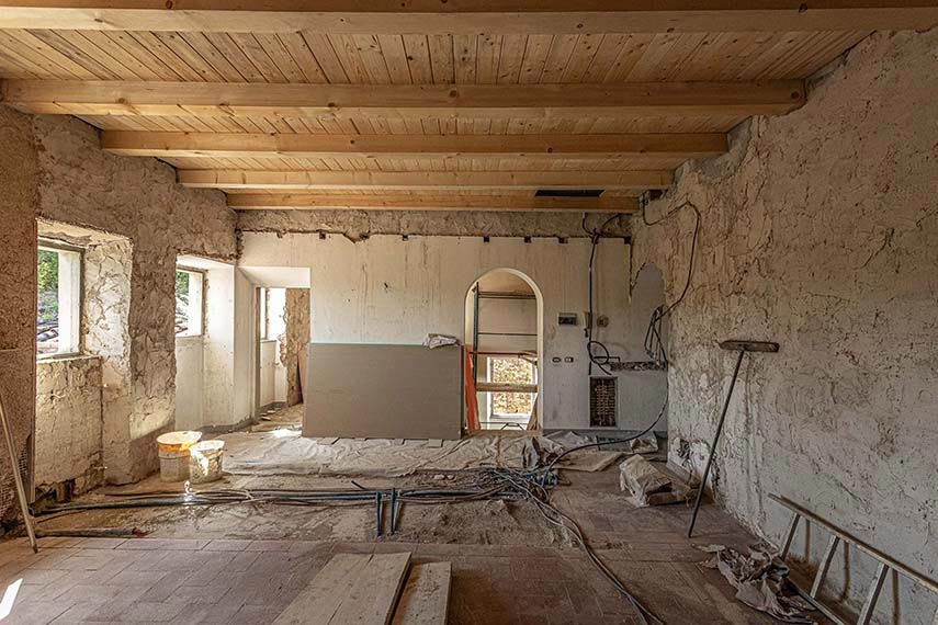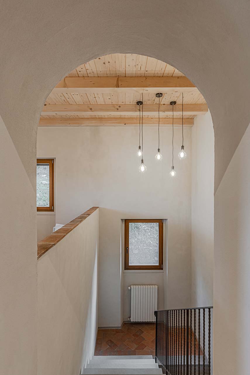El proyecto de renovación de la casa es realizado por Officina Abitare e incluye el reforzamiento estructural del edificio, la renovación de algunos entrepisos, el mejoramiento energético y, en el piso superior, la nueva disposición del plano para la creación de las cuatro habitaciones con baño para el b&b. Los nuevos tabiques son de cartón yeso para garantizar ligereza y precisión, los materiales elegidos son tradicionales y sostenibles: termoarcillas de cal natural y corcho, pinturas de estuco de cal natural y, para entrepisos y muebles, el gran protagonista: la madera