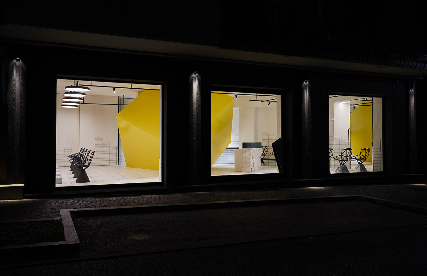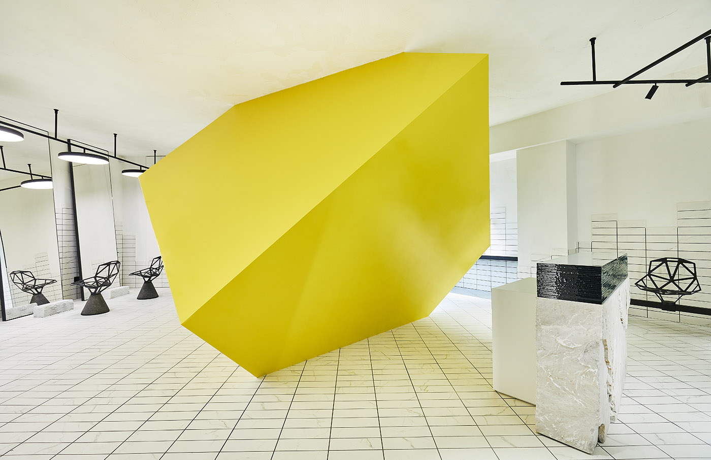 Las formas geométricas del mobiliario de Magis y, para los artículos a medida, de Perimetro Arredamenti Srl, recuerdan las del cubo amarillo y contribuyen a dar al espacio ese toque original, moderno y sofisticado